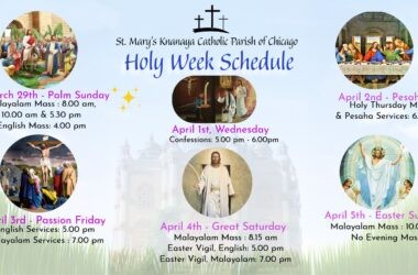 ചിക്കാഗോ: യേശുക്രിസ്തുവിന്റെ രാജകീയമായ ജറൂസലേം പ്രവേശനം, പീഢാനുഭവം, കുരിശുമരണം, ഉയര്ത്തെഴുന്നേല്പ് എന്നിവ അനുസ്മരിക്കുന്ന വിശുദ്ധ വാരത്തിലേക്കു ലോകമെമ്പാടുമുള്ള ക്രൈസ്തവരോടൊപ്പം മോര്ട്ടന് ഗ്രോവ് സെന്റ് മേരീസ്…