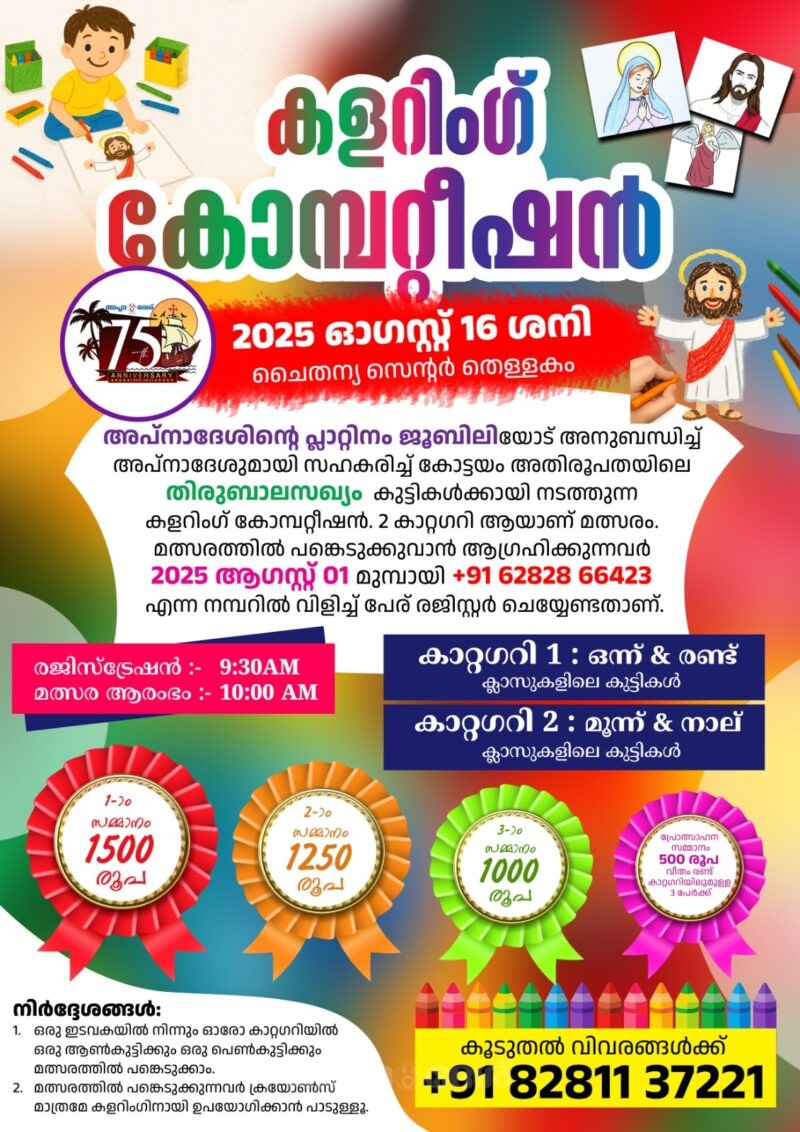 കോട്ടയം: അപ്നാദേശ് പ്ലാറ്റിനം ജൂബിലിയോടനുബന്ധിച്ച് കോട്ടയം അതിരൂപത തിരുബാലസഖ്യവുമായി സഹകരിച്ച് കുട്ടികള്ക്കായി കളറിംഗ് മത്സരം നടത്തുന്നു. ഓഗസ്റ്റ് 16 ന് ചൈതന്യ പാസ്റ്ററല് സെന്ററിലാണ് മത്സരം. രാവിലെ 9.30 ന് രജിസ്ട്രേഷന് ആരംഭിക്കും. കാറ്റഗറി ഒന്ന് വിഭാഗത്തില് ഒന്ന്, രണ്ട് ക്ലാസിലെ കുട്ടികളും കാറ്റഗറി രണ്ടില് മൂന്ന്, നാല് ക്ലാസുകളിലെ കുട്ടികളുമാണ് പങ്കെടുക്കേണ്ടത്. മത്സരത്തില് പങ്കെടുക്കാന് ആഗ്രഹിക്കുന്നവര് ഓഗസ്റ്റ് 1 ന് മുമ്പായി 6282866423 എന്ന നമ്പറില് വിളിച്ച് പേര് രജിസ്റ്റര് ചെയ്യണം. ഒന്നാം സമ്മാനം 1500/- രൂപയും രണ്ടാം സമ്മാനം 1250/- രൂപയും മൂന്നാം സമ്മാനം 1000/- രൂപയും നല്കും. കൂടാതെ രണ്ട് കാറ്റഗറിയിലുമുള്ള മൂന്ന് പേര്ക്ക് 500/- രൂപ വീതം പ്രേത്സാഹനസമ്മാനവും ഉണ്ടാവും. ഒരു ഇടവകയില് നിന്ന് ഓരോ കാറ്റഗറിയില് ഒരു ആണ്കുട്ടിക്കും ഒരു പെണ്കുട്ടിക്കും പങ്കെടുക്കാം.