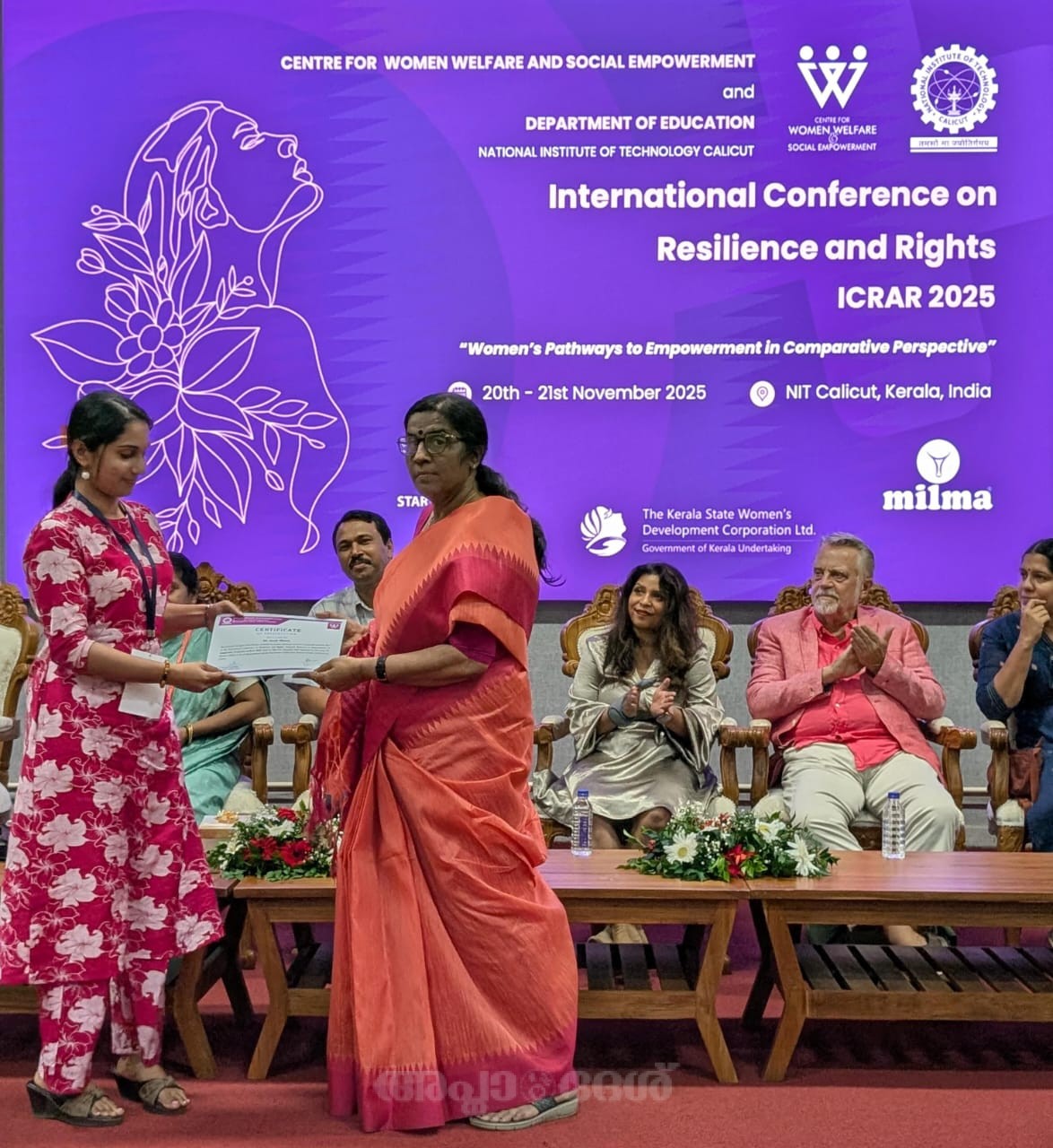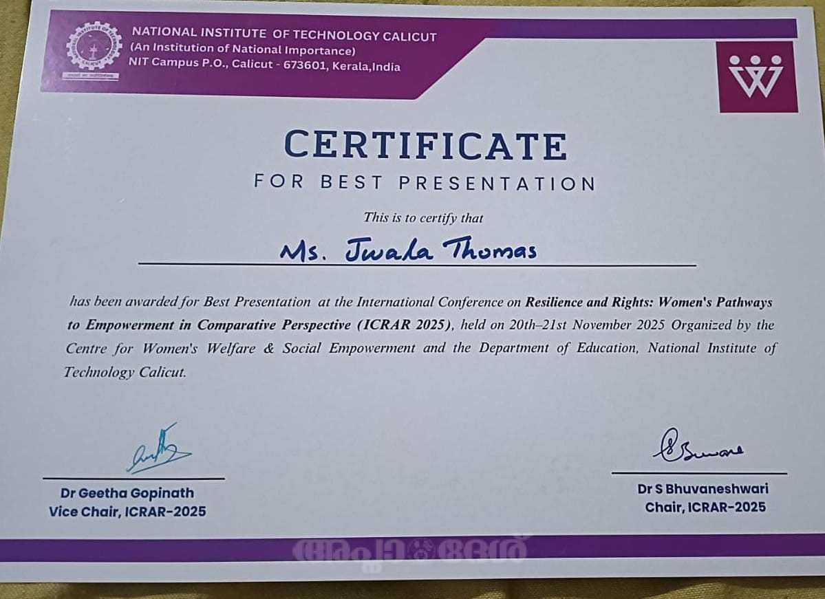 കോഴിക്കോട് നാഷനല് ഇന്സ്റ്റിറ്യൂട്ട് ഓഫ് ടെക്നോളജി ഡിപാര്ട്ട്മെന്റ് ഓഫ് എഡ്യുകേഷനും സെന്റര് ഫോര് വിമന്സ് വെല്ഫയര് ആന്റ് സോഷ്യല് എംപവര്മെന്റും സംയുക്തമായി നവംബര് 20 ,21 തീയതികളില് സംഘടിപ്പിച്ച ദ്വിദിന അന്താരാഷ്ട്ര കോണ്ഫറന്സില് മടമ്പം പി. കെ. എം. കോളേജ് ഓഫ് എഡ്യുകേഷനിലെ സോഷ്യല് സയന്സ് വിഭാഗം അധ്യാപക വിദ്യാര്ഥിനി മിസ്. ജ്വാലാ തോമസ് മികച്ച പേപ്പര് അവതരണത്തിനുള്ള അവാര്ഡ് കരസ്ഥമാക്കി. ‘Gender Sensitivity in Teacher Education Institutions: Pathways Towards SDG 5’ എന്ന വിഷയത്തില് ആണ് പേപ്പര് അവതരിപ്പിച്ചത്. പി. കെ. എം. കോളേജ് ഓഫ് എഡ്യൂക്കേഷന് ഫിസിക്കല് സയന്സ് വിഭാഗം അദ്ധ്യാപകന് ഡോ. പ്രശാന്ത് മാത്യുവിന്റെ മാര്ഗ്ഗനിര്ദേശത്തില് ആണ് പേപ്പര് തയ്യാറാക്കിയത്. കോണ്ഫറന്സില് 60 പേപ്പര് പ്രസന്റേഷനുകള് അവതരിപ്പിക്കപ്പെട്ടു, അതില് ആറു പേപ്പറുകള് മികച്ച പ്രസന്റേഷന് അവാര്ഡിനായി തിരഞ്ഞെടുക്കപ്പെട്ടു.