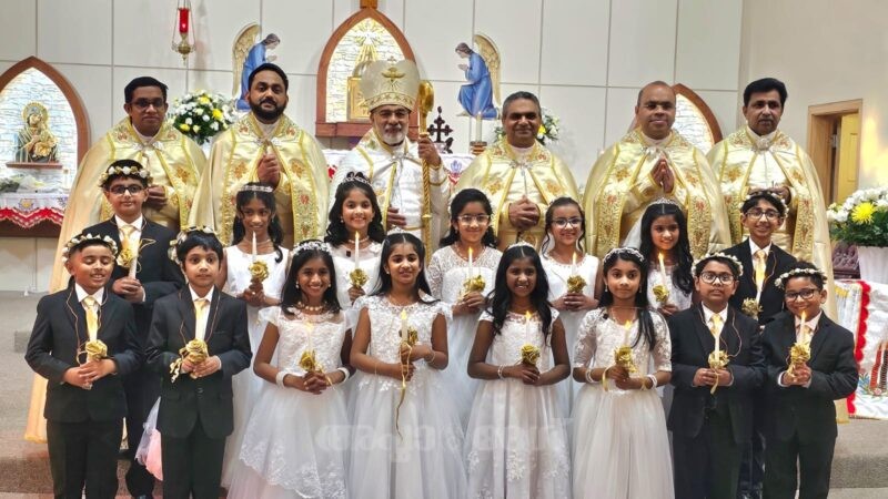 ചിക്കാഗോ: ബെന്‍സന്‍വില്‍ തിരുഹൃദയ ക്‌നാനായ കത്തോലിക്കാ ഫൊറോന ഇടവകയിലെ പതിനഞ്ച് മാലാഖാക്കുത്തുങ്ങളുടെ ആഘോഷമായ ദിവ്യകാരുണ്യസ്വീകരണം മെയ് 24 ശനിയാഴ്ച വൈകുന്നേരം 4 മണിക്ക് കോട്ടയം അതിരൂപത മെത്രാപ്പോലിത്ത മാര്‍ മാത്യു മൂലക്കാട്ട് മെത്രാപ്പോലീത്തയുടെ മുഖ്യ കാര്‍മ്മികത്ത്വത്തില്‍ ഭക്തി സാന്ദ്രമായി നടത്തപ്പെട്ടു. ഇടവക ജനം മുഴുവന്റെയും അനുഗ്രഹീത സാന്നിധ്യം കൊണ്ടും മനോഹരവും ചിട്ടയായ ക്രമീകരണം കൊണ്ടും തിരുഹൃദയ ദൈവാലയത്തിലെ ആഘോഷമായ ദീവ്യകാരുണ്യ സ്വീകരണം ഏറെ ശ്രദ്ധേയമായി. അഭിവന്ദ്യ മാര്‍ മാത്യു മൂലക്കാട്ട് മെത്രാപ്പോലീത്തായോടൊപ്പം വികാരി ഫാ.തോമസ് മുളവനാല്‍, സെന്റ് മേരീസ് പള്ളി വികാരി ഫാ.സിജു മുടക്കോടില്‍, കൈപ്പുഴ സെന്റ് ജോര്‍ജ് ഫെറോന വികാരി ഫാ. സാബു മാലിത്തുരുത്തേല്‍, അസി.വികാരിമാരായ ഫാ. ബിന്‍സ് ചേത്തലില്‍,ഫാ. അനീഷ് മാവേലിപുത്തന്‍പുരയില്‍ എന്നിവര്‍ സഹ കാര്‍മ്മികരായി തിരുകര്‍മ്മത്തില്‍ പങ്കെടുത്തു. പുതിയ ദൈവാലയത്തിലേക്ക് മാറ്റപ്പെട്ടതിന് ശേഷമുളള രണ്ടാമത്തെ ആഘോഷമായ ദിവ്യകാരുണ്യസ്വീകരണത്തിന് മാതാപിതാക്കളുടെയും ദൈവാലയ എക്‌സിക്യുട്ടീവ് അംഗങ്ങളായ തോമസ് നെടുവാമ്പുഴ, മത്തിയാസ് പുല്ലാപ്പള്ളില്‍, സാബു മുത്തോലം, കിഷോര്‍ കണ്ണാല, ജെന്‍സന്‍ ഐക്കരപറമ്പില്‍, മതബോധന അദ്ധ്യാപകരായ ആന്‍സി ചേലയ്ക്കല്‍, മഞ്ജു ചകിരിയാംതടത്തില്‍ എന്നിവര്‍ നേതൃത്വം നല്‍കി. ഈ വര്‍ഷം സമാന്ത കണ്ടാരപ്പളളില്‍, ആന്റണി കരിമ്പുംകാലായില്‍, ജേക്കബ് മൂന്നുപറയില്‍, ആഡലിന്‍ വെള്ളാപ്പിള്ളില്‍, സെമീറ വെള്ളാപ്പിള്ളില്‍, ബെഞ്ചമിന്‍ മലേമുണ്ടയ്ക്കല്‍, റൈലി മലേമുണ്ടയ്ക്കല്‍, എമ്മലൈന്‍ കുളത്തില്‍കരോട്ട്, അമായ പുഴക്കരോട്ട് , ജെനീസ് കരുനാട്ട്, ആലിസന്‍ മുണ്ടുപാലത്തിങ്കല്‍, നാഡ്‌ലിന്‍ പുതുശ്ശേരില്‍, നോവ വഞ്ചിപ്പുരയ്ക്കല്‍, ജെസ്വിന്‍ ഒറവക്കുഴിയില്‍, നോവ ഈന്തുംകാട്ടില്‍, എന്നിവരാണ് ആഘോഷമായ ദിവ്യകാരുണ്യം സ്വീകരിച്ചത്. തിരുക്കര്‍മ്മങ്ങള്‍ക്ക് ശേഷം ദൈവാലയ ഹാളില്‍ കുട്ടികള്‍ക്ക് സ്വീകരണവും കലാപരിപാടികളും സ്‌നേഹവിരുന്നും ക്രമീകരിച്ചിരുന്നു. ഇടവക ദൈവജനം മുഴുവന്‍ പ്രാര്‍ത്ഥനയോടെ ഈ പുണ്യദിനത്തിനായി ഒരുങ്ങിയതിന് കുഞ്ഞുങ്ങളുടെ മാതാപിതാക്കള്‍ പ്രത്യേകം നന്ദി പറഞ്ഞു.