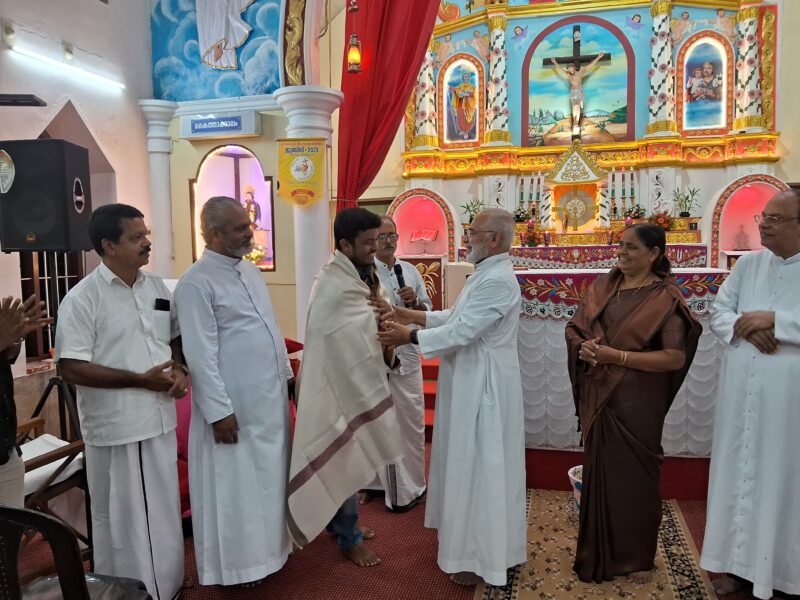 തിരുവനന്തപുരം ഇന്ത്യന് ഇന്സ്റ്റിറ്റ്യൂട്ട് ഓഫ് സയന്സ് എഡ്യൂക്കേഷന് ആന്ഡ് റിസര്ച്ച് നിന്നും ((IISER) നിന്നും കെമിസ്ട്രിയില് ഡോക്ടറേറ്റ് നേടിയ പൂഴിക്കോല് ഇടവകാംഗമായ ബ്ളെസണ് സണ്ണിയെ കെ.സി.സി ,കെ.സി .ഡബ്ള്യൂ.എ ,കെ.സി.വൈ.എല് എന്നീ സമുദായ സംഘടനകളുടെ നേതൃത്വത്തില് നടന്ന ചടങ്ങില് കോട്ടയം അതിരൂപത അധ്യക്ഷന് മാര് മാത്യു മൂലക്കാട്ട് മെത്രാപ്പോലീത്ത പൊന്നാട അണിയിച്ചു ആദരിക്കുന്നു.