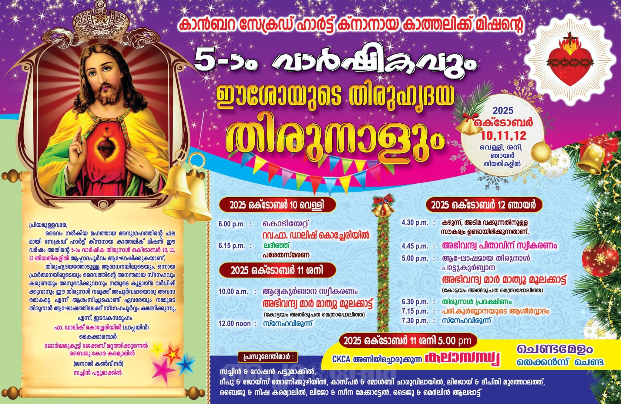 കാന്ബറ സേക്രഡ് ഹാര്ട്ട് ക്നാനായ കാത്തലിക് മിഷന്റെ 5-ാം വാര്ഷികവും ഈശോയുടെ തിരുഹൃദയ തിരുനാളും കോട്ടയം അതിരൂപത മെത്രാന് മാര് മാത്യു മൂലക്കാട്ടിനോടൊപ്പം ഒക്ടോബര് 10, 11 12 തീയതികളില് യാരാലമല സെന്റ് പീറ്റര് ചാനല് പള്ളിയില് ഭക്തിയാദരവോടെ ആഘോഷിച്ചു.