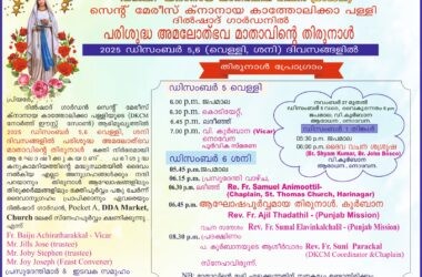 ഡല്ഹി: ദില്ഷാദ് ഗാര്ഡന് സെന്റ് മേരീസ് ക്നാനായ കത്തോലിക്ക പള്ളിയില് പരി.അമലോത്ഭവ മാതാവിന്െറ തിരുനാള് ഡിസംബര് 5,6 തീയതികളില് ആഘോഷിക്കും.