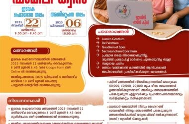 കോട്ടയം: കോട്ടയം അതിരൂപത ചെറുപുഷ്പ മിഷന്ലീഗിന്റെ ആഭിമുഖ്യത്തില് 5, 6, 7 ക്ലാസുകളില് പഠിക്കുന്ന കുട്ടികള്ക്കായി നടത്തപ്പെടുന്ന ത്രിദിന ക്യാമ്പ് ചൈതന്യ പാസ്റ്ററല് സെന്ററില്വച്ച്…
