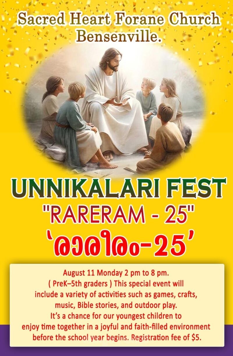 ചിക്കാഗോ: ബെന്‍സന്‍വില്‍ തിരുഹൃദയ ക്‌നാനായ കത്തോലിക്കാ ഫൊറോന ദൈവാലയത്തില്‍ കുട്ടികള്‍ക്കായ് ‘ രാരീരം 25 ‘ കൂട്ടായ്മ ഇടവകയിലെ യുവജനങ്ങളുടെ നേതൃത്വത്തില്‍ സംഘടിപ്പിക്കുന്നു. ഒന്നാം ക്ലാസു മുതല്‍ അഞ്ചാം ക്ലാസു വരെയുള്ള കുട്ടികളെ ഉള്‍പെടുത്തിക്കൊണ്ട് ആഗസ്റ്റ് 11 തിങ്കളാഴ്ച ഉച്ചകഴിഞ്ഞ് 2 മുതല്‍ വൈകിട്ട് 8 വരെയാണ് പരിപാടി സംഘടിപ്പിക്കുന്നത്. കഴിഞ്ഞ രണ്ടു മാസക്കാലമായി എല്ലാ ഞായറാഴ്ചകളിലും ദൈവലയത്തില്‍ സംഘടിപ്പിച്ചുപോന്ന ‘ഉണ്ണിക്കളരി ‘ ‘ ഗുരുകുലം ‘ പാഠ്യപദ്ധതിയുടെ ഭാഗമായിട്ടാണ് യുവജനങ്ങള്‍ ഇത് സംഘടിപ്പിക്കുന്നത്. ബൈബിള്‍ വിജ്ഞാന ക്ലാസുകള്‍ , വിവിധ കളികള്‍, പാട്ടുകള്‍, ചിത്രരചനകള്‍ തുടങ്ങിയ ഇവയില്‍ ഉള്‍പ്പെടുത്തിയിട്ടുണ്ട്. ഹന്നാ ചേലയ്ക്കല്‍, എലെയ്ന്‍ ഒറ്റത്തയ്ക്കല്‍, സാറ മുളയാനിക്കുന്നേല്‍, സെറീന മുളയാനിക്കുന്നേല്‍, അല്‍ഫോന്‍സ പുള്ളോര്‍ക്കുന്നേല്‍ എന്നിവര്‍ ‘ രാരീരം 25 ‘ ന്നേതൃത്വം നല്‍കും