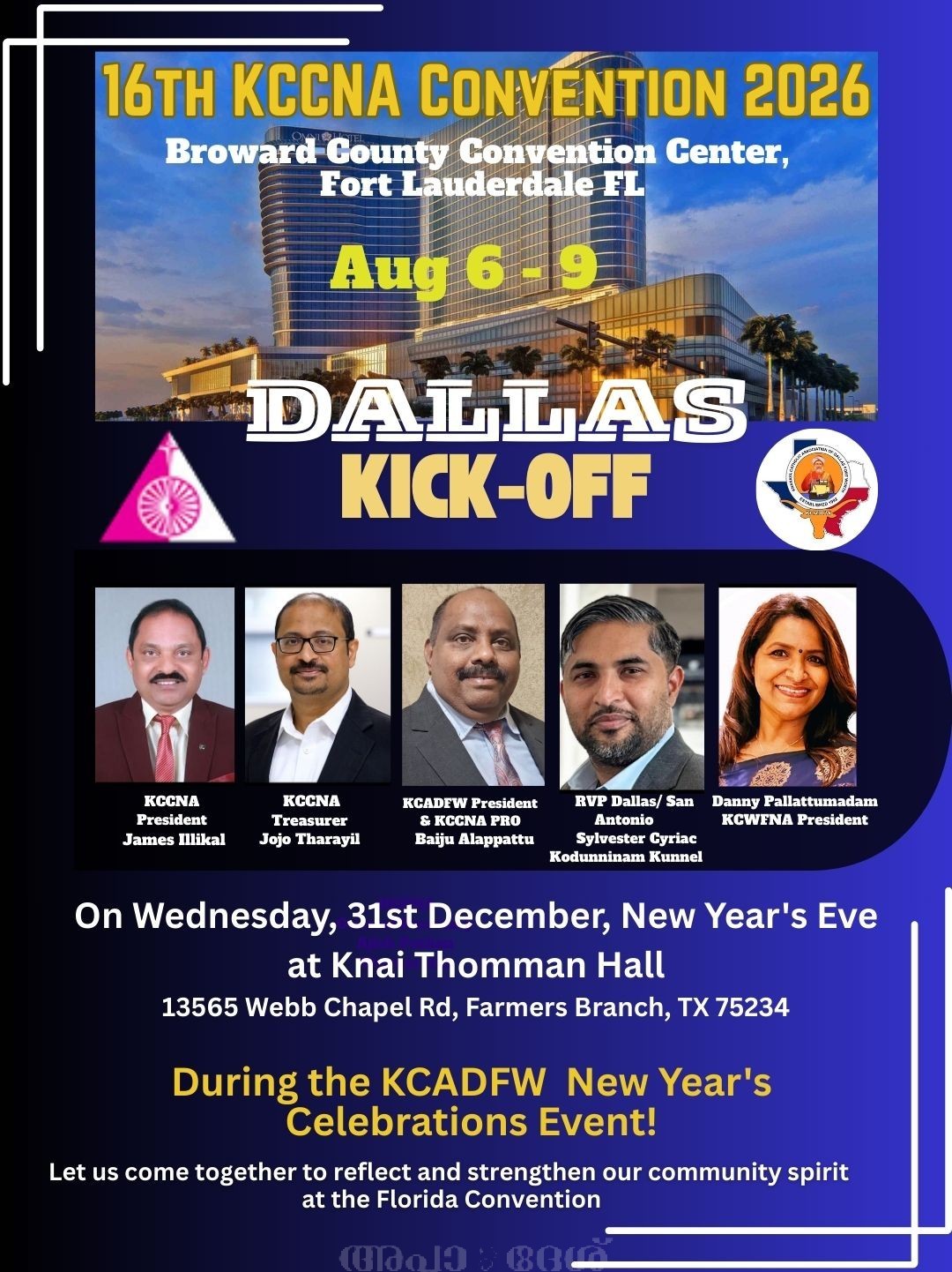 ഫാര്മേഴ്സ് ബ്രാഞ്ച്, ടെക്സാസ്: ഡാലസ്ഫോര്ട്ട് വര്ത്ത് ക്നാനായ കത്തോലിക്കാ അസോസിയേഷന് (KCADFW) 2026-നെ വരവേല്ക്കുന്നതിനായി ഡിസംബര് 31-ാം തീയതി ബുധനാഴ്ച, ഫാര്മേഴ്സ് ബ്രാഞ്ചിലുള്ള ക്നായിതൊമ്മന് ഹാളില് വിപുലമായ പുതുവത്സരാഘോഷ പരിപാടി സംഘടിപ്പിക്കുന്നു. വിശ്വാസവും സൗഹൃദവും സാമൂഹിക ഐക്യവും ഒരുമിപ്പിക്കുന്ന ഈ ആഘോഷം ഡാളസ് ക്നാനായ സമൂഹത്തിനു ഒരു പ്രത്യേക അനുഭവമായിരിക്കും. വൈകുന്നേരം 6:30-ന് ആരംഭിക്കുന്ന പുതുവത്സര തിരുകര്മ്മങ്ങളോടെയാണ് പരിപാടികള്ക്ക് തുടക്കമാകുന്നത്. തുടര്ന്ന് രാത്രി 8:30 മുതല് പുതുവത്സരാഘോഷ പരിപാടികള് അരങ്ങേറും. ഡാലസ് ക്രൈസ്റ്റ് ദി കിംഗ് ക്നാനായ കത്തോലിക്കാ ദേവാലയത്തിന്റെ വികാരി ഫാ. ബിന്സ് ചേത്തലില് പുതുവത്സര അനുഗ്രഹ സന്ദേശം നല്കും. ഈ ആഘോഷവേദിയില് വടക്കേ അമേരിക്കയിലെ ക്നാനായ സമൂഹത്തിന്റെ സുപ്രധാന സംഗമമായ 16-ാമത് കെസിസിഎന്എ കണ്വെന്ഷന് – 2026-ന്റെ ഔദ്യോഗിക കിക്ക്-ഓഫും നടത്തപ്പെടും. 2026 ആഗസ്റ്റ് 6 മുതല് 9 വരെ ഫ്ളോറിഡയിലെ ഫോര്ട്ട് ലോഡര്ഡെയിലിലെ ബ്രോവാര്ഡ് കൗണ്ടി കണ്വെന്ഷന് സെന്ററിലാണ് ഈ നാഷണല് കണ്വന്ഷന് നടക്കുന്നത്. പുതുവത്സരാഘോഷത്തിന്റെ ഭാഗമായി ഡാലസ് യൂണിറ്റിനായുള്ള കെ.സി.സി.എന്.എ കണ്വെന്ഷന് രജിസ്ട്രേഷന് ഔദ്യോഗികമായി ആരംഭിക്കുകയും, സമൂഹാംഗങ്ങളെ ഈ മഹത്തായ ദേശീയ സംഗമത്തില് പങ്കുചേരാന് ക്ഷണിക്കുകയും ചെയ്യും.