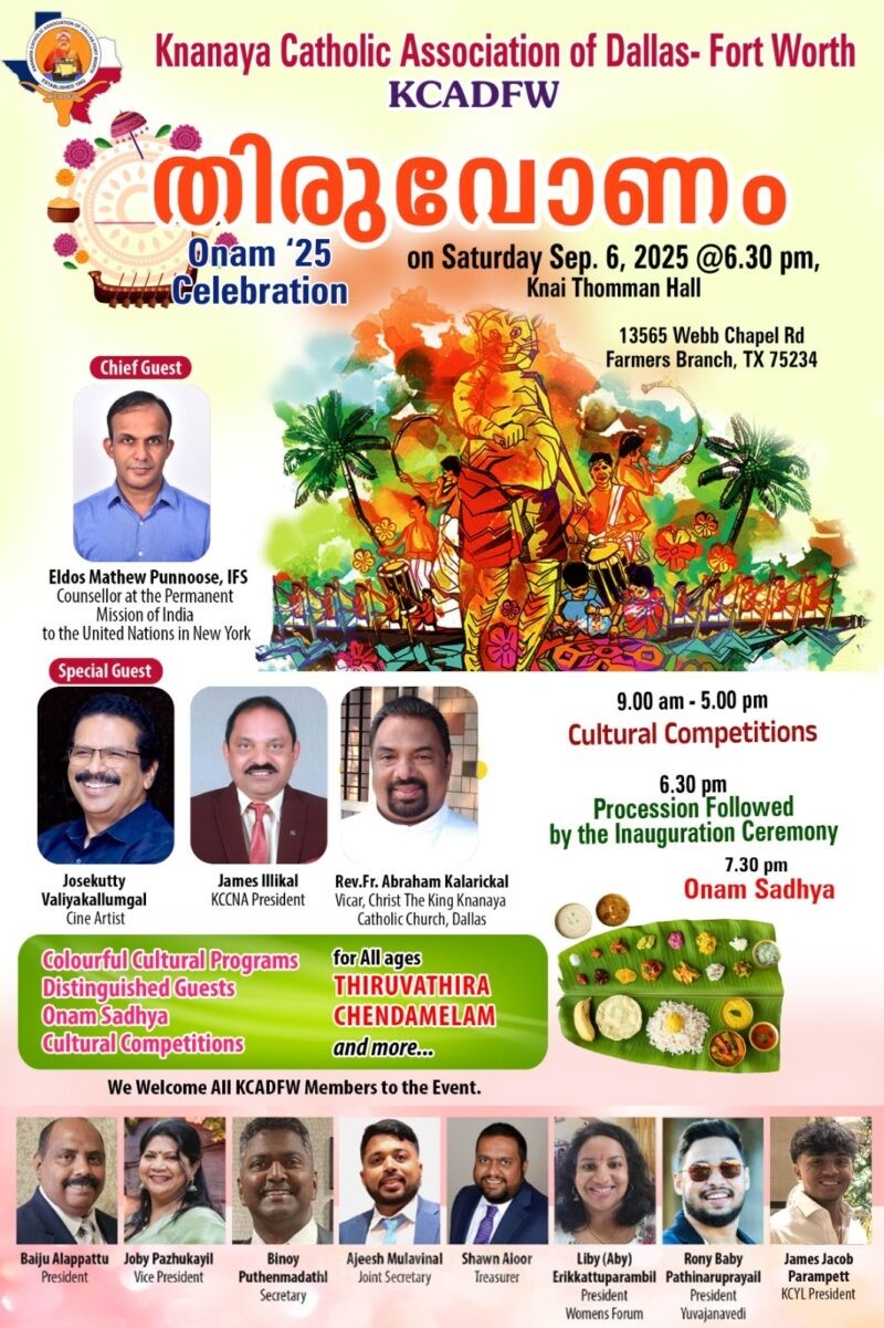 ഡാളസ്: DFW മെട്രോപ്ലെക്സിലെ ക്നാനായ സമുദായംഗങ്ങള് ആകാംഷയോടെ കാത്തിരിക്കുന്ന ക്നാനായ കാത്തലിക് അസോസിയേഷന് ഓഫ് ഡാളസ്ഫോര്ട്ട് വര്ത്ത് (KCA DFW) ന്റെ ഈ വര്ഷത്തെ ഓണാഘോഷം (ഓണം’25) , സെപ്റ്റംബര് 6 ശനിയാഴ്ച ഫാര്മേഴ്സ് ബ്രാഞ്ചിലെ ക്നായി തോമ്മന് ഹാളില് വെച്ച് നടത്തപ്പെടുമെന്നു എക്സിക്യൂട്ടീവ് കമ്മറ്റിക്കുവേണ്ടി പ്രസിഡന്റ് ബൈജു പുന്നൂസ് ആലപ്പാട്ടും സെക്രട്ടറി ബിനോയ് പുത്തന്മഠത്തിലും അറിയിച്ചു . കേരളത്തിന്റെ സമ്പന്നമായ പാരമ്പര്യങ്ങള് പ്രദര്ശിപ്പിക്കുന്ന വര്ണ്ണാഭമായ സാംസ്കാരിക ഘോഷയാത്രയോടെ വൈകുന്നേരം 6:30 നു ആഘോഷങ്ങള് ആരംഭിക്കും. ചെണ്ടമേളങ്ങളുടെയും താലപ്പൊലികളുടെയും അകമ്പടിയോടെ അതിഥികളെയും മാവേലിമന്നനെയും ആഘോഷനഗരിയിലേക്കു ആനയിക്കും . ഡാളസ് കമ്മ്യൂണിറ്റിയിലുള്ള എല്ലാ പ്രായത്തിലുമുള്ള പ്രതിഭാധനരായ അംഗങ്ങളെ ഒരുമിച്ച് കൊണ്ടുവരുന്ന ഏതാണ്ട് 35 -ല്പരം കലാമത്സരങ്ങള് രാവിലെ 9:00 മുതല് വൈകുന്നേരം 5:00 വരെ നടക്കും. ഇത്തവണത്തെ ഓണാഘോഷത്തിന് സമൂഹത്തിലെ വിവിധ തലങ്ങളില് പ്രഗല്ഭരായ വിശിഷ്ടാതിഥികളെ ലഭിച്ചതിലും അവരെ സ്വാഗതം ചെയ്യുന്നതില് KCADFW അഭിമാനിക്കുന്നുവെന്ന് പ്രസിഡന്റ് കൂട്ടിച്ചേര്ത്തു . *മുഖ്യതിഥി: എല്ദോസ് മാത്യു പുന്നൂസ് IFS : ന്യൂയോര്ക്കിലെ ഐക്യരാഷ്ട്രസഭയിലേക്കുള്ള ഇന്ത്യയുടെ സ്ഥിരം ദൗത്യത്തിലെ കൗണ്സിലര്* *വിശിഷ്ട അതിഥി: ജോസുകുട്ടി വലിയകല്ലുങ്കല് , പ്രശസ്ത സിനിമാ കലാകാരന്* *മുഖ്യ പ്രഭാഷകന്: ജെയിംസ് ഇല്ലിക്കല്- കെസിസിഎന്എ പ്രസിഡന്റ്* *ഓണസന്ദേശം: റെവ. ഫാ. എബ്രഹാം കളരിക്കല് – വികാരി ഡാളസ് ക്രൈസ്റ്റ് ദി കിംഗ് ക്നാനായ കാത്തലിക് ചര്ച്ച്* മുഖ്യതിഥിയായി പങ്കെടുക്കുന്ന ചെങ്ങന്നൂര് കല്ലിശ്ശേരി സ്വദേശിയായ എല്ദോസ് മാത്യു പുന്നൂസ് ഒരു ഇന്ത്യന് നയതന്ത്രജ്ഞനാണ്, നിലവില് ന്യൂയോര്ക്കിലെ ഐക്യരാഷ്ട്രസഭയിലേക്കുള്ള ഇന്ത്യയുടെ സ്ഥിരം ദൗത്യത്തില് കൗണ്സിലറായി സേവനമനുഷ്ഠിക്കുന്നു. കഴിഞ്ഞ വര്ഷമാണ് അദ്ദേഹം തന്റെ നിലവിലെ നിയമനം ഏറ്റെടുത്തത്. ഇന്ത്യന് മിഷന്റെ പൊളിറ്റിക്കല് കോര്ഡിനേറ്ററും ഐക്യരാഷ്ട്രസഭ സുരക്ഷാ കൗണ്സിലുമായുള്ള ഇന്ത്യയുടെ പ്രധാന ഇടപെടലുകളുടെ പ്രധാന വ്യക്തിയുമാണ് അദ്ദേഹം. പ്രത്യേകിച്ചും, മിഡില് ഈസ്റ്റുമായി ബന്ധപ്പെട്ട വിഷയങ്ങളില് അദ്ദേഹം ശ്രദ്ധ കേന്ദ്രീകരിക്കുന്നു. മീഡിയ ടീമിന്റെയും തലവനാണ് അദ്ദേഹം.
