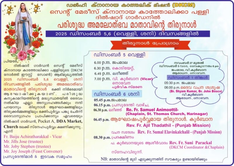 ഡല്‍ഹി: ദില്‍ഷാദ് ഗാര്‍ഡന്‍ സെന്‍റ് മേരീസ് ക്നാനായ കത്തോലിക്ക പള്ളിയില്‍ പരി.അമലോത്ഭവ മാതാവിന്‍െറ തിരുനാള്‍ ഡിസംബര്‍ 5,6 തീയതികളില്‍ ആഘോഷിക്കും.