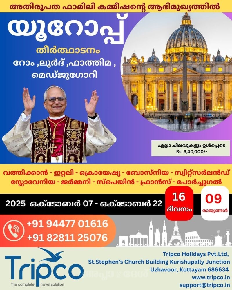 അതിരൂപത ഫാമിലി കമ്മീഷന്റെ ആഭിമുഖ്യത്തില് യൂറോപ്പ് തീര്ത്ഥാടനം നടത്തപ്പെടുന്നു. ഒക്ടോബര് 07 മുതല് 22 വരെ റോമില് പരിശുദ്ധ പിതാവ് ലിയോ പാപ്പയെ സന്ദര്ശിച്ചു മെജുഗോറിയും ലൂര്ദും ഫാത്തിമയും ഉള്പ്പെടെ സന്ദര്ശിക്കുന്ന യാത്രയുടെ ബുക്കിംഗ് പുരോഗമിക്കുന്നു.റോമിലെ സെന്റ് പീറ്റേഴ്സ് ബസിലിക്ക, കൊളോസിയം, ഫ്രാന്സിസ് പാപ്പാ അന്ത്യവിശ്രമം കൊള്ളുന്ന മരിയ മജോരെ കത്തീഡ്രല്, പാദുവായിലെ സെന്റ് ആന്റണിയുടെ ബസിലിക്കയും കല്ലറയും, അസ്സീസിയിലെ വിശുദ്ധ ഫ്രാന്സിസിന്റെ ദേവാലയവും കല്ലറയും, ക്ലാര പുണ്യവതിയുടെ ദേവാലയം, കല്ലറ, കാര്ലോ അസിക്യൂട്ടീസിന്റെ തിരുശേഷിപ്പും കല്ലറയും, വിശുദ്ധ വിന്സെന്റ് ഡിപോളിന്റെ പാരിസിലെ കല്ലറയും തിരു ശേഷിപ്പും, മെജുഗോറിയില് മരിയന് ദര്ശനങ്ങള് നടക്കുന്ന ദേവാലയവും മലമ്പ്രദേശവും, ലൂര്ദ് മാതാവിന്റെ ഗ്രോട്ടോ, ബസിലിക്ക, മെഴുകുതിരി പ്രദക്ഷിണം, ഫാത്തിമ തുടങ്ങിയ വിശുദ്ധ സ്ഥലങ്ങള് ഈ യാത്രയില് ഉള്പ്പെടുന്നു.
