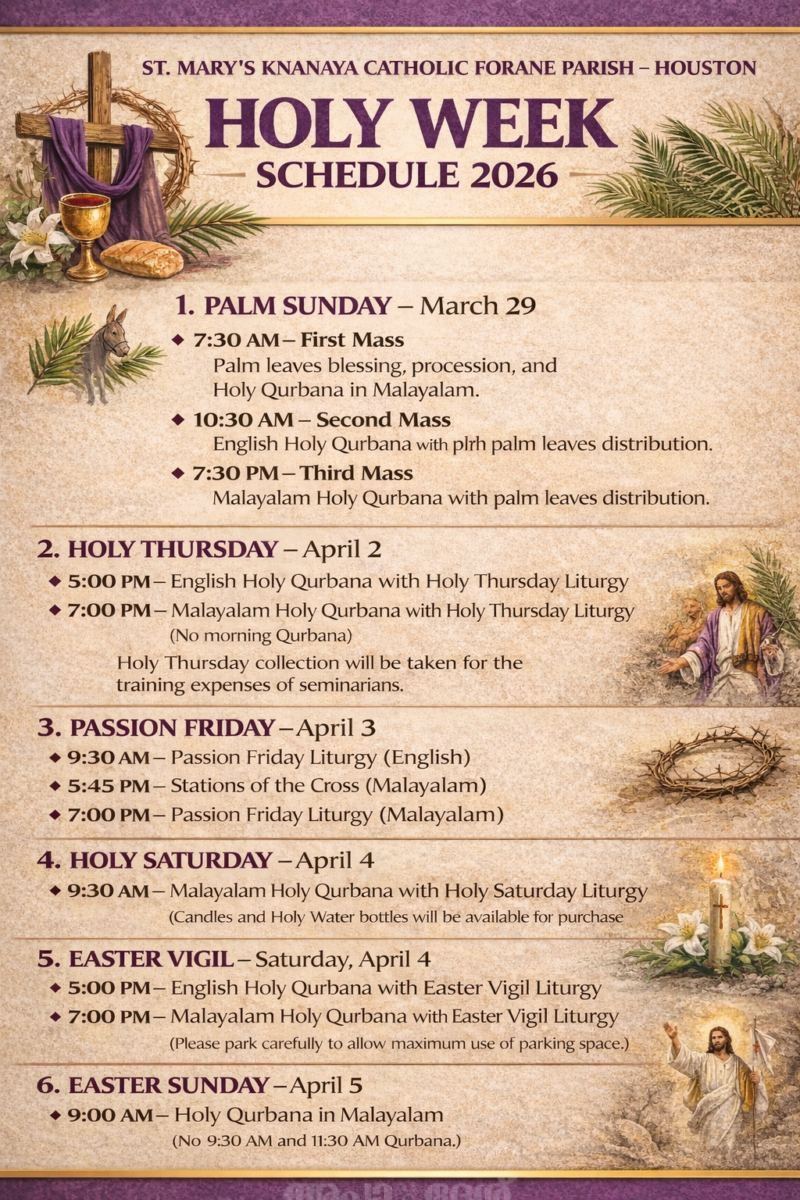 ഹൂസ്റ്റണ് സെന്റ് മേരീസ് ക്നാനായ കത്തോലിക്കാ ഫൊറോന പള്ളിയില് ഈ വര്ഷത്തെ (2026) വിശുദ്ധവാര തിരുക്കര്മ്മങ്ങളുടെ സമയക്രമം അറിയിച്ചു. യേശുക്രിസ്തുവിന്റെ പീഡാനുഭവവും കുരിശുമരണവും തിരുവുത്ഥാനവും അനുസ്മരിക്കുന്ന വിശുദ്ധവാര ചടങ്ങുകളിലേക്ക് വികാരി ഫാ. എബ്രഹാം മുത്തോലത്തും അസിസ്റ്റന്റ് വികാരി ഫാ. ജോഷി വലിയവീട്ടിലും വിശ്വാസികളെ സ്വാഗതം ചെയ്തു.