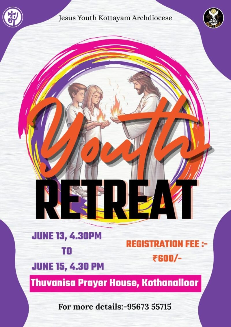 കോട്ടയം അതിരൂപത ജീസസ് യൂത്ത ജൂണ് 13 വെള്ളിയാഴ്ച 5:00പി.എം മുതല് ജൂണ് 15 ഞായറാഴ്ച 4:30പി.എം വരെ കോതനല്ലൂര് തൂവാനിസ പ്രാര്ത്ഥനാലയത്തില് വച്ച് 16 നും 30 നും ഇടയില് പ്രായമുള്ള യുവതീയുവാക്കള്ക്കായി യുവജന ധ്യാനം നടത്തുന്നു. +2 കഴിഞ്ഞ് പുതിയ കോഴ്സിനായി കാത്തിരിക്കുന്ന യുവജനങ്ങളെ പ്രത്യേകം ഈ ധ്യാനത്തിലേക്ക് സ്വാഗതം ചെയ്യുന്നു.