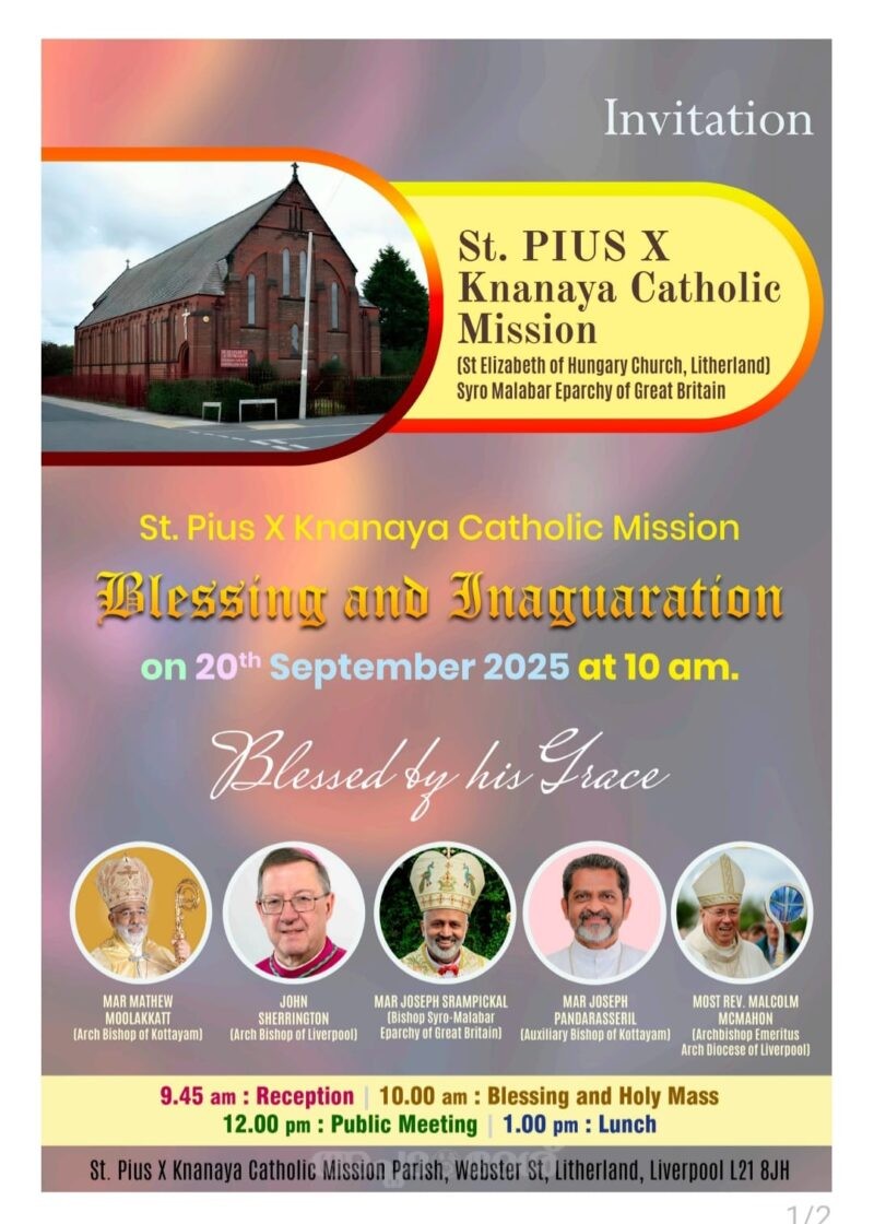 ലിവര്പൂള് : കോട്ടയം അതിരൂപതാ അംഗങ്ങളായ ക്നാനായ കത്തോലിക്കാ വിശ്വാസികള്ക്കായി ലിവര്പൂളില് St.Pius X ക്നാനായ കാത്തലിക് മിഷന് ലഭിച്ച ദേവാലയ കൂദാശാ കര്മ്മങ്ങള് ശനിയാഴ്ച രാവിലെ 10 മണിക്ക് കോട്ടയം അതിരൂപത മെത്രാപ്പോലീത്ത അഭിവന്ദ്യ മാര് മാത്യു മൂലക്കാട്ട് പിതാവിന്റെയും അതിരൂപതാ സഹായ മെത്രാന് അഭിവന്ദ്യ മാര് ജോസഫ് പണ്ടാരശ്ശേരില് പിതാവിന്റേയും, മറ്റു അഭിവന്ദ്യ പിതാക്കന്മാരുടെയും വൈദികരുടെയും. സാന്നിധ്യത്തില് നിര്വഹിക്കുന്നും യുകെയിലെ ക്നാനായ കത്തോലിക്ക വിശ്വാസികള്ക്ക് ഇത് ഒരു പുണ്യനിമിഷമാണ്. വെഞ്ചരിപ്പിനെ തുടര്ന്ന് പിതാക്കന്മാരുടെ കാര്മികത്വത്തില് യുകെയിലെ എല്ലാ ക്നാനായ വൈദികരും മറ്റു നിരവധി വൈദികരും ചേര്ന്നൂള്ള കുര്ബാനയും തുടര്ന്ന് പബ്ലിക് മീറ്റിംഗും ഉണ്ടായിരിക്കും . ശനി, ഞായര് ദിവസങ്ങളിലായി ദേവാലയത്തില് 40 മണി ആരാധനയും ഉണ്ടായിരിക്കും. ഈ മഹനീയ നിമിഷങ്ങള്ക്ക് സാക്ഷികളാകുവാന് എല്ലാവരെയും ക്ഷണിക്കുന്നതായി മിഷന് കോഡിനേറ്റര് ഫാദര് സുനി പടിഞ്ഞാറേക്കര അറിയിച്ചു. ദേവാലയ നടത്തിപ്പിനും പരിപാടികളുടെ വിജയത്തിനുമായി ഡീക്കന് അനില് ലൂക്കോസ്, കൈകാരന്മാരായ ഫിലിപ്പ് കുഴിപറമ്പില്, ജോയി പാവകുളത്ത്, സോജന് തോമസ് മുകളേല്വടക്കേതില്, ജോജോ ജോസ് വലിയവീട്ടില് എന്നിവരുടെ നേതൃത്വത്തില് ഒരുക്കങ്ങള് പൂര്ത്തിയായി. ശനിയാഴ്ച രാവിലെ 10 മണി മുതല് വെഞ്ചരിപ്പ് കര്മ്മങ്ങള് ലൈവായി ലഭിക്കുന്നതാണ്.