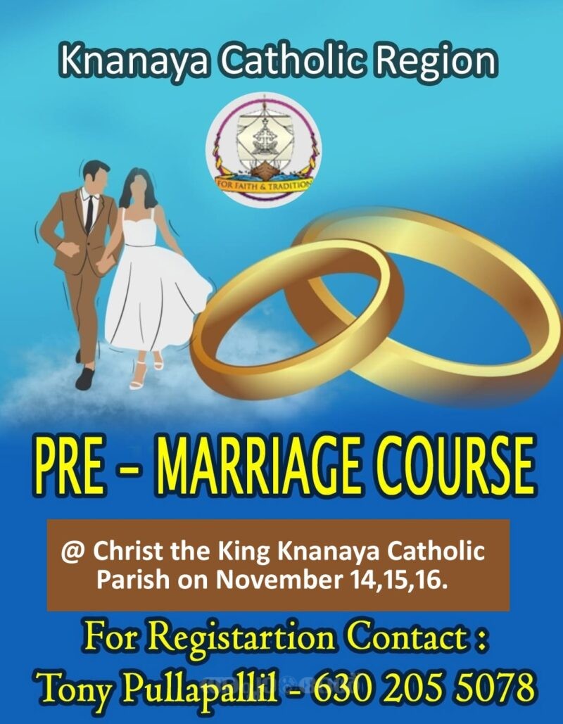 ക്നാനായ റീജിയന് ഫാമിലി കമ്മീഷന്റെ നേതൃത്വത്തില് മൂന്ന് ദിവസത്തെ വിവാഹ ഒരുക്ക കോഴ്സ് ഡാളസ്റ്റ് ക്രിസ്തുരാജ ക്നാനായ കത്തോലിക്ക ദൈവാലയത്തില് വച്ച് നവംബര് 14,15,16, തിയതികളില് നടത്തപ്പെടും. വൈദികരും അല്മായരും അടങ്ങുന്ന റിസോഷ്സ് ടീം അംഗങ്ങള് പങ്കെടുക്കുന്നവര്ക്ക് ക്ലാസ്സുകള് എടുക്കും . മുന്കൂട്ടി രജിട്രര് ചെയ്യുന്നവര്ക്കാണ് ഇതില് പങ്കെടുക്കാന് കഴിയുന്നത്. പങ്കെടുക്കാന് ആഗ്രഹിക്കുന്ന യുവതീ യുവാക്കള് കോഴ്സ് കോര്ഡിനേറ്റര് ടോണി പുല്ലാപള്ളിയുമായി (630 205 5078 ) ബന്ധപ്പെടേണ്ടതാണ്.