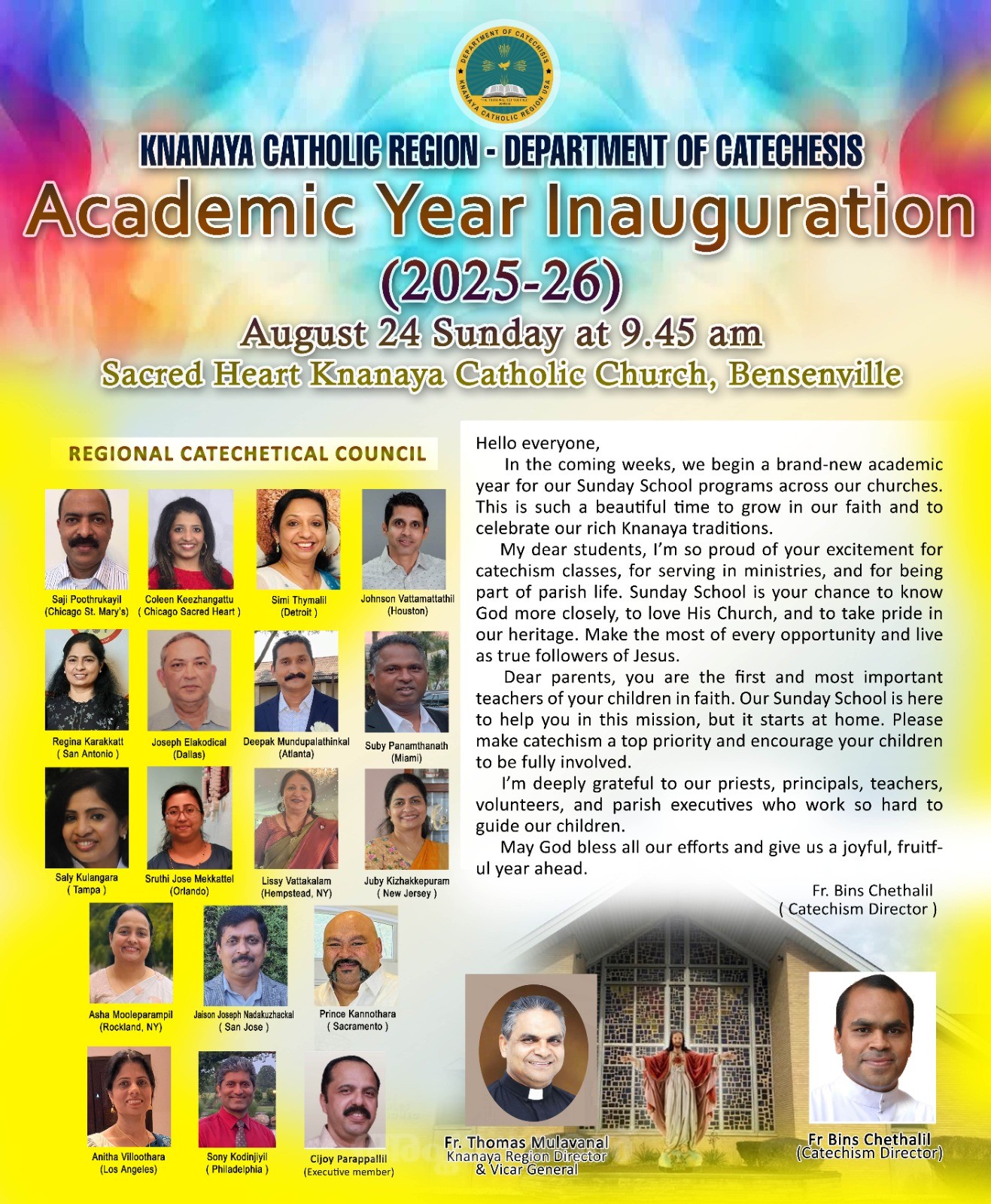 Chicago: The Knanaya Region inaugurated the 2025–2026 Sunday School academic year with a solemn ceremony held at Sacred Heart Knanaya Catholic Forane Church, Chicago. The event was officially inaugurated by Vicar General and Regional Director, Rev. Fr. Thomas Mulavanal. Regional Faith Formation Director, Rev. Fr. Bins Chethallil, delivered the keynote address during the program.