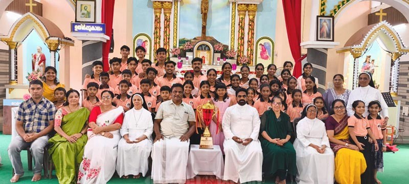 വിശ്വാസ പരിശീലനത്തില് 50-100 വിദ്യാര്ത്ഥികളുടെ വിഭാഗത്തില് A+ നേടി മികച്ച സണ്ഡേ സ്കൂളായി തെരഞ്ഞെടുക്കപ്പെട്ട പയസ് മൗണ്ട് സെന്റ് പയസ് ടെന്ത് സണ്ഡേ സ്കൂള് കുട്ടികള് – വികാരി ഫാ.വിന്സണ് പുളിവേലില്, ഹെഡ്മാസ്റ്റര് സിറിയക് ചൊള്ളമ്പേല്, വിശ്വാസ പരിശീലന അധ്യാപകര് എന്നിവരോടൊപ്പം.