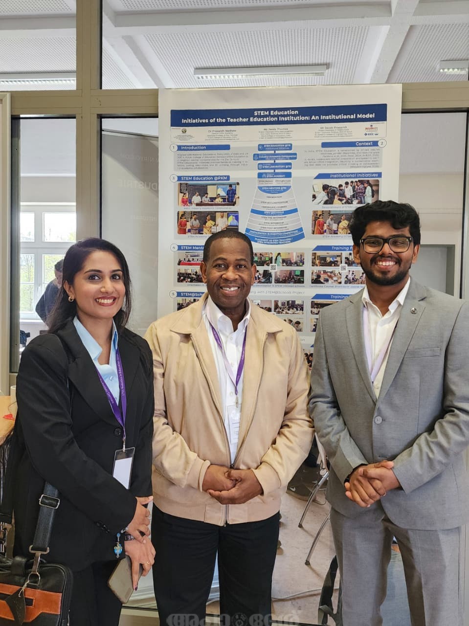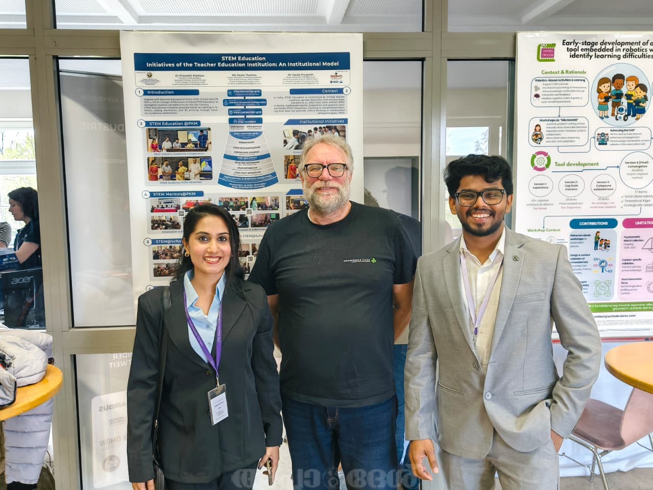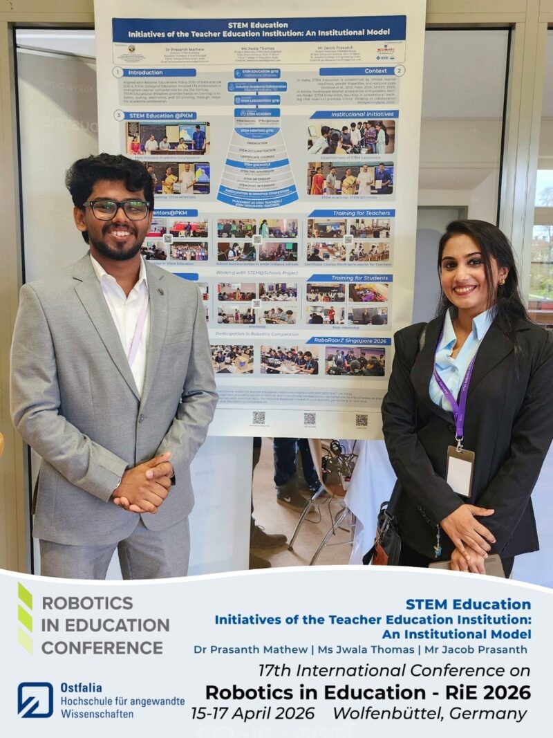 മടമ്പം: ജര്മ്മനിയിലെ ഒസ്ഫാലിയ യൂണിവേഴ്സിറ്റി ഓഫ് അപ്ലൈഡ് സയന്സസ് ഇല് വെച്ച് ഏപ്രില് 15 മുതല് 17 വരെ നടന്ന 17-ാമത് ഇന്റര്നാഷണല് കോണ്ഫറന്സ് ഓണ് റോബോട്ടിക്സ് ഇന് എഡ്യൂക്കേഷന് (RiE 2026)-ല് മടമ്പം പി. കെ. എം. കോളേജ് ഓഫ് എഡ്യൂക്കേഷന് ടീമിന്റെ ഗവേഷണ പോസ്റ്റര് ശ്രദ്ധേയമായി. ‘STEM എഡ്യൂക്കേഷന് ഇനിഷി യേറ്റീവ്സ് ഓഫ് ടീച്ചര് എഡ്യൂക്കേഷന് ഇന്സ്ടിട്യൂഷന് : ആന് ഇന്സ്ടിട്യൂഷണല് മോഡല് ‘ എന്ന ശീര്ഷകത്തിലുള്ള പോസ്റ്ററാണ് അവതരിപ്പിച്ചത്. പോസ്റ്റര് തയ്യാറാക്കിയത് ഡോ . പ്രശാന്ത് മാത്യു (ഡയറക്ടര് , STEM അക്കാദമി & അസോസിയേറ്റ് പ്രൊഫസര് , വൈസ് പ്രിന്സിപ്പല് , പി. കെ. എം. കോളേജ് ഓഫ് എഡ്യൂക്കേഷന് ), ജ്വാല തോമസ് (പ്രൊജക്റ്റ് അസോസിയേറ്റ് , STEM Mentors@PKM), ജേക്കബ് പ്രശാന്ത് (പ്രൊജക്റ്റ് അസോസിയേറ്റ് , STEM@Schools, സെന്റ്. ജോസഫ്സ് കോളേജ് ഓഫ് എഞ്ചിനീയറിംഗ് , പാലാ) എന്നിവരാണ്. ഇന്ത്യയുടെ നാഷണല് എഡ്യൂക്കേഷന് പോളിസി 2020യും UN സസ്റ്റൈനബിള് ഡെവലപ്പ്മെന്റ് ഗോള് 4ഉം അടിസ്ഥാനമാക്കി പി.കെ.എം. കോളേജ് ഓഫ് എഡ്യൂക്കേഷന്റെ ഇന്സ്ടിട്യൂഷന് ഇന്നോവേഷന് കൗണ്സില് കൊച്ചിയിലെ സൃഷ്ടി റോബോട്ടിക്സ് ആന്ഡ് ടെക്നോളോജീസ് Pvt. Ltd-മായി സഹകരിച്ച് റോബോട്ടിക്സ്, കോഡിംഗ്, ഇലക്ട്രോണിക്സ്, 3D പ്രിന്റിംഗ് എന്നീ മേഖലകളില് നടത്തിയ STEM പ്രായോഗിക പരിശീലന പരിപാടികളുടെ സ്ഥാപന മാതൃകയാണ് കോണ്ഫറന്സില് അവതരിപ്പിച്ചത്. STEM പരിശീലന ക്ലാസുകള്ക്ക് നേതൃത്വം നല്കുന്നത് സുനില് പോള് , സി.ഇ.ഒ., സൃഷ്ടി റോബോട്ടിക്സ് ആന്ഡ് ടെക്നോളോജീസ് ആണ്. ഈ പ്രവര്ത്തനങ്ങളുടെ ഭാഗമായി പി.കെ.എം. കോളേജ് ഓഫ് എഡ്യൂക്കേഷനെ ”സെന്റര് ഫോര് STEM എഡ്യൂക്കേഷന് ഇനിഷിയേറ്റീവ് ‘ ആയി Adv. Sajeev Joseph, എം.എല്.എ., ഔദ്യോഗികമായി പ്രഖ്യാപിച്ചിട്ടുണ്ട്. ഇതോടൊപ്പം 2026 വര്ഷത്തേക്കുള്ള സ്റ്റം വിദ്യാഭ്യാസത്തിലെ ഒരു വര്ഷത്തെ സര്ട്ടിഫിക്കേഷന് പ്രോഗ്രാം ആരംഭിച്ചിട്ടുണ്ട്. റോബോട്ടിക്സിന്റെ വിദ്യാഭ്യാസത്തിലെ പ്രയോഗം, ക്ലാസ്റൂമുകളിലെ കൃത്രിമ ബുദ്ധി (AI), STEM അധിഷ്ഠിത പഠനരീതികള്, സാങ്കേതികവിദ്യ ഉപയോഗിച്ചുള്ള നവീന പഠനരീതികള് എന്നിവ ഉള്പ്പെടെ നിരവധി വിഷയങ്ങളെ ആസ്പദമാക്കി ഏകദേശം 60 ഗവേഷണ പ്രബന്ധങ്ങള് അവതരിപ്പിക്കപ്പെട്ടു. ഇന്ത്യയില് നിന്നുള്ള രണ്ട് ടീമുകള് മാത്രമാണ് സമ്മേളനത്തില് പങ്കെടുത്തത്.