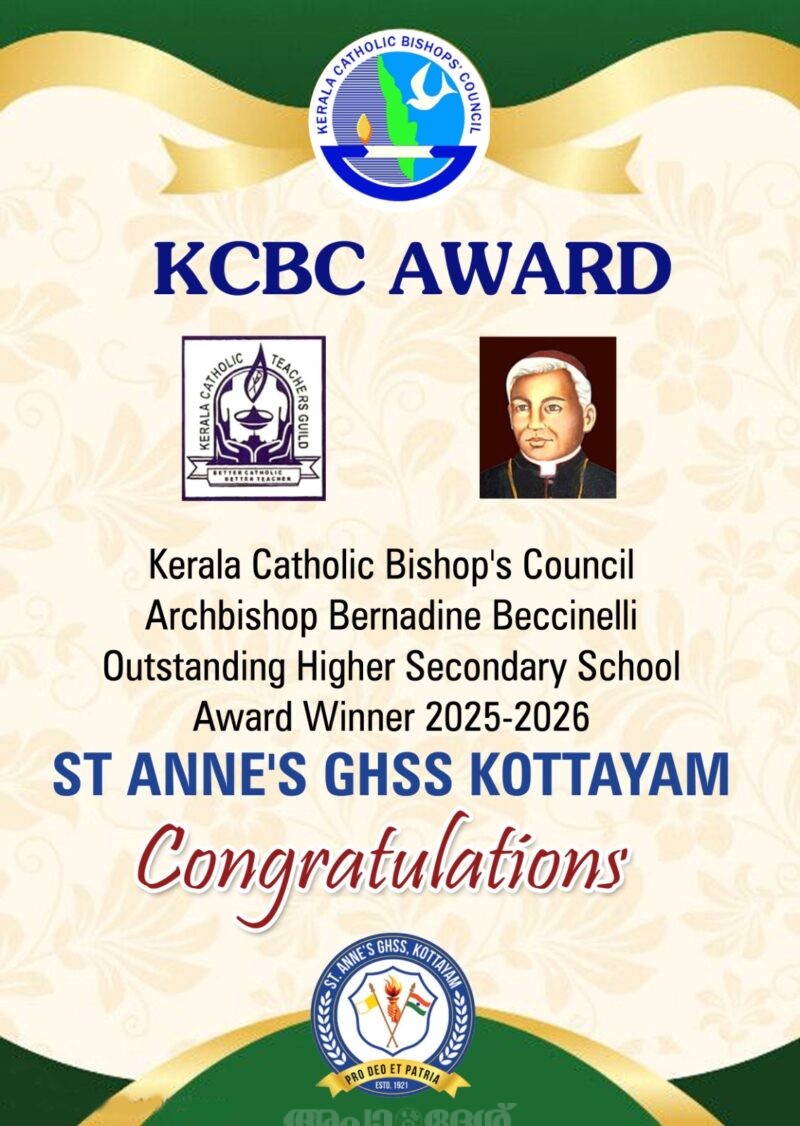കെ സി ബി സിയും കേരള കാത്തലിക് ടീച്ചേഴ്സ് ഗില്‍ഡും ചേര്‍ന്ന് , മികച്ച വിദ്യാലയങ്ങള്‍ക്ക് നല്‍കുന്ന നല്‍കുന്ന ഒൗട്ട്സ്റ്റാന്‍്റിംഗ് ഹയര്‍ സെക്കന്‍്ററി സ്കൂള്‍ അവാര്‍ഡ് കോട്ടയം സെന്‍്റ് ആന്‍സ് ഹയര്‍ സെക്കന്‍ഡറി സ്കൂള്‍ നേടി . 2026 ഫെബ്രു 13, 14 തിയതികളില്‍ ചങ്ങനാശ്ശേരിയില്‍ നടക്കുന്ന കേരള കാത്തലിക് ടീച്ചേഴ്സ് ഗില്‍ഡ് സംസ്ഥാന സമ്മേളനത്തില്‍ വെച്ച് പ്രിന്‍സിപ്പല്‍ ജോബി ജോസഫും അധ്യാപകരും ചേര്‍ന്ന് അവാര്‍ഡ് ഏറ്റുവാങ്ങും.