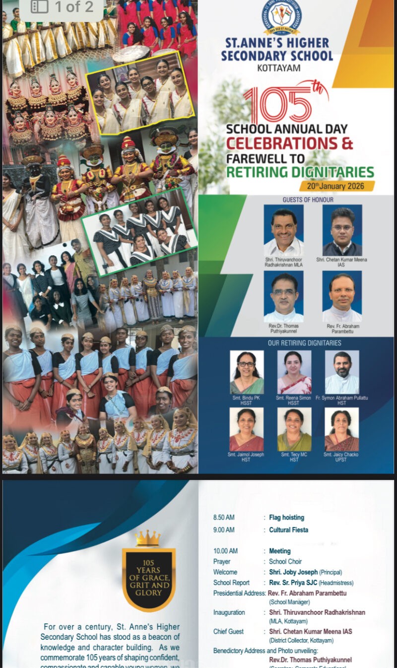കോട്ടയം ജില്ലയിലെ പ്രമുഖ വിദ്യാഭ്യാസ സ്ഥാപനമായ സെന്റ് ആന്സ് ഹയര് സെക്കന്ററി സ്കൂളിന്റെ നൂറ്റിയഞ്ചാം വാര്ഷികാഘോഷവും യാത്രയയപ്പ് സമ്മേളനവും ജനുവരി 20ന് BCM കോളേജ് ഓഡിറ്റോറിയത്തില് വച്ച് സംഘടിപ്പിക്കും. രാവിലെ 10 മണിക്ക് ആരംഭിക്കുന്ന വാര്ഷിക സമ്മേളനം കോട്ടയം MLA തിരുവഞ്ചൂര് രാധാകൃഷ്ണന് ഉല്ഘാടനം ചെയ്യും. കോട്ടയം ജില്ലാ കളക്ടര് ചേതന് കുമാര് മീണ മുഖ്യാതിഥിയായിരിക്കും. ഈ വര്ഷം സര്വീസില് നിന്ന് വിരമിക്കുന്ന ബിന്ദു പി. കെ, റീനാ സൈമണ്, ഫാ. സൈമണ് എബ്രഹാം പുല്ലാട്ട്, ജെയ്മോള് ജോസഫ്, ടെസ്സി എം. സി, ജെയ്സി ചാക്കോ എന്നിവര്ക്കാണ് യാത്രയയപ്പ് നല്കുന്നത്. വിദ്യാര്ത്ഥികളുടെ വര്ണ്ണപ്പകിട്ടാര്ന്ന കലാപരിപാടികള് അരങ്ങേറും. ദേശീയ, സംസ്ഥാന തലത്തില് , അക്കാദമിക്, കായികം, കലാ രംഗങ്ങളില് വിജയികളായവര്ക്ക് സമ്മാനങ്ങളും സര്ട്ടിഫിക്കറ്റുകളും വിതരണം ചെയ്യും.