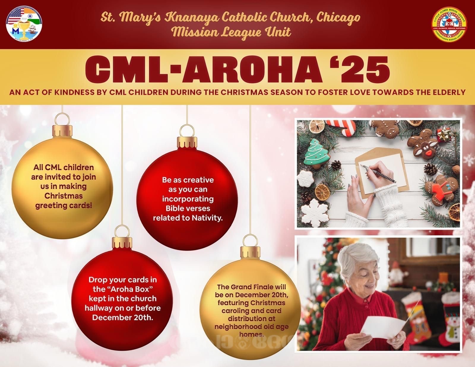 ചെറുപുഷ്പ മിഷന് ലീഗിന്റെ ആഭിമുഖ്യത്തില് ക്രിസ്തുമസിനൊരുക്കമായി അറോഹാ 2025 എന്ന പേരില് ക്രിസ്തുമസ് ആശംസാകാര്ഡുകള് തയ്യാറാക്കി ക്രിസ്തുമസ് കരോളുമായി ഇടവകയുടെ സമീപ പ്രദേശങ്ങളിലുള്ള നേഴ്സിങ്ങ് ഹോമുകള് ഡിസംബര് 20 ശനിയാഴ്ച സന്ദര്ശിക്കും.