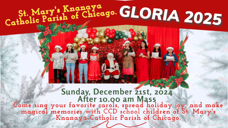ചിക്കാഗോ : സെന്റ് മേരീസ് ക്നാനായ കത്തോലിക്കാ ഇടവകയില് ക്രിസ്തുമസിനോടനുബന്ധിച്ച് പൊതുവായ ക്രിസ്തുമസ് കരോള് ആഘോഷങ്ങള് സംഘടിപ്പിക്കുന്നു. ഡിസംബര് 21 ഞായറാഴ്ച രാവിലെ പത്തുമണിക്കുള്ള കുര്ബ്ബാനയ്ക്ക് ശേഷമാണ് ഇടവകയുടെ മതബോധന സ്കൂളിലെ കുട്ടികളും വിവിധ മിനിസ്ട്രികളും കൂടാരയോഗങ്ങളും ചേര്ന്ന് വിപുലമായ പൊതുവായ കരോള് ആഘോഷങ്ങള് പാരിഷ് ഹാളില് സംഘടിപ്പിക്കുന്നത്. ആഘോഷങ്ങളുടെ ഭാഗമായി ക്രിസ്തുമസ് കരോള് ഗാനാലാപനവും വൈവിധ്യമാര്ന്ന വിനോദപരിപാടികളും സംഘടിപ്പിക്കും.
