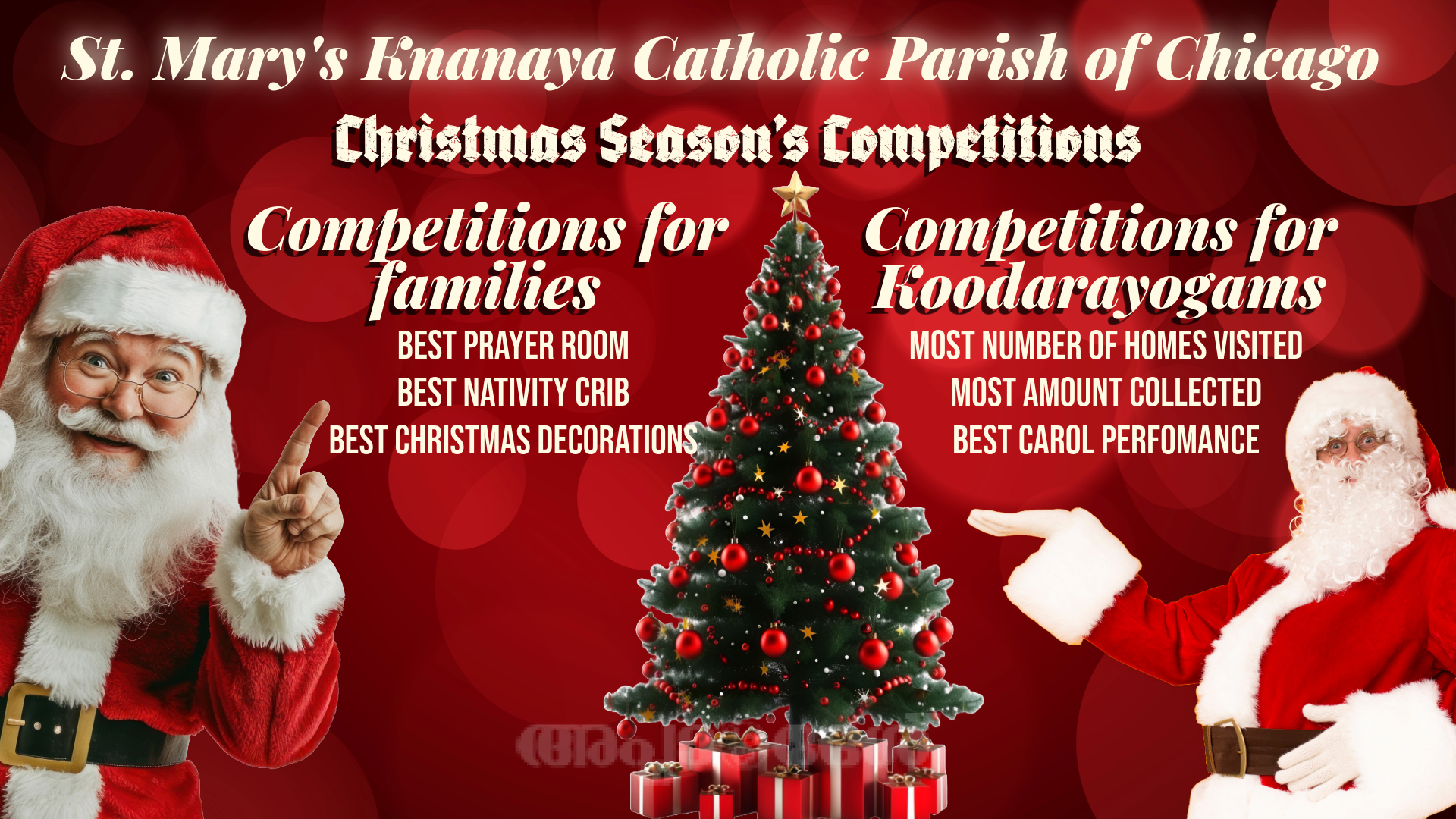 ക്രിസ്തുമസിനൊരുക്കമായി ഇടവക തലത്തില് മികച്ച പ്രാര്ത്ഥനാമുറി, മികച്ച പുല്ക്കൂട്, മികച്ച ക്രിസ്തുമസ് അലങ്കാരങ്ങള് എന്നിവയ്ക്ക്കായുള്ള മത്സരങ്ങള് സംഘടിപ്പിക്കുന്നുണ്ട്. കൂടാതെ കൂടാരയോഗ തലത്തില് ഏറ്റവും കൂടുതല് ഭവനങ്ങള് സന്ദര്ശിച്ച കൂടാരയോഗം, ഏറ്റവും കൂടുതല് കരോള് സംഭാവനകള് സ്വരൂപിച്ച കൂടാരയോഗം, ഏറ്റവും മികച്ച കരോള് പ്രകടനം നടത്തിയ കൂടാരയോഗം എന്നിവര്ക്കായുള്ള മത്സരങ്ങളും പതിവുപോലെ ഇത്തവണയും സംഘടിപ്പിക്കുന്നുണ്ട്. നവീന് കണിയാപറമ്പില് ജെസ്ലിന് പ്ലാത്താനത്ത് എന്നിവരാണ് ഇടവകതലത്തില് ക്രിസ്തുമസ് കരോളിന് നേതൃത്വം നല്കുന്നത്.