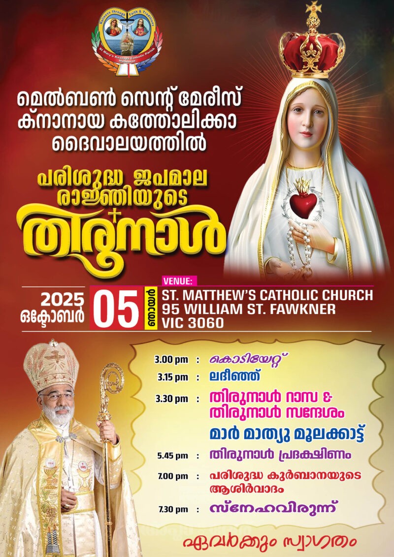 മെല്ബണ് സെന്്റ് മേരിസ് ക്നാനായ കത്തോലിക്ക ഇടവകയില് പരിശുദ്ധ ജപമാല റാണിയുടെ തിരുന്നാള് ഒക്ടോബര് അഞ്ചാം തീയതി ഞായറാഴ്ച സെന്്റ് മാത്യൂസ് ചര്ച്ച്, ഫോക്നറില് വെച്ച് നടത്തപ്പെടും. ഉച്ചയ്ക്ക് 3 മണിക്ക് കൊടിയേറ്റും, അതിനെ തുടര്ന്ന് ആഘോഷമായ തിരുന്നാള് റാസ കുര്ബാനയും, തുടര്ന്ന് പ്രദക്ഷിണവും വിശുദ്ധ കുര്ബാനയുടെ വാഴ്വും ഉണ്ടായിരിക്കും. ഇടവകാംഗങ്ങള് ഒത്തൊരുമയോടെ പ്രസുദേന്തിമാരായി നടത്തുന്ന ഈ തിരുന്നാളില്, ആര്ച്ച് ബിഷപ്പ് മാര് മാത്യു മൂലക്കാട് വിശുദ്ധ കുര്ബാനയില് മുഖ്യ കാര്മികത്വം നിര്വഹിക്കുകയും തിരുന്നാള് സന്ദേശം നല്കുകയും ചെയ്യും. ഫാ. ഡിക്സണ് ജോര്ജ് കുരിയപ്പള്ളില് പ്രദക്ഷിണത്തിന് നേതൃത്വം നല്കും. വിശുദ്ധ കുര്ബാനയുടെ ആശീര്വാദം സീറോ മലബാര് മെല്ബണ് വെസ്റ്റ് വികാരി ഫാ. ജോസഫ് എഴുമലയില് നിര്വഹിക്കും. ഇടവക വികാരി ഫാ. അബിലാഷ് തോമസ് കണ്ണാമ്പടം, തിരുന്നാള് ജനറല് കണ്വീനര് ടോം പഴയംപള്ളില്, കൈക്കാരന്മാരായ സിജോ ചാലയില്, മനോജ് മാത്യു വള്ളിത്തോട്ടത്തില്, സെക്രട്ടറി വിനോദ് ജോസഫ് മുളകനാല്, മറ്റ് തിരുന്നാള് കമ്മിറ്റി അംഗങ്ങള്, പാരിഷ് കൗണ്സില് അംഗങ്ങള്, കൂടാരയോഗ ഭാരവാഹികള് എന്നിവരുടെ നേതൃത്വത്തില് എല്ലാവിധ ഒരുക്കങ്ങളും പൂര്ത്തിയായിട്ടുണ്ട്. ഇടവകാംഗങ്ങളുടെ അഭിമാന കൂട്ടായ്മകളായ സെന്്റ് മേരിസ് ഇടവക ഗായകസംഘം, ബീറ്റ്സ് ഓഫ് മെല്ബണ് ചെണ്ടമേളം & നാസിക് ഡോള്, മെല്ബണ് മാരാര് ചെണ്ട മേളം , മെല്ബണ് സ്റ്റാര്സ് ചെണ്ടമേളം , എന്നിവരുടെ പ്രകടനങ്ങളും തിരുന്നാള് പരിപാടികള്ക്ക് മാറ്റു കൂട്ടും. തിരുനാളിന് വിവിധ കമ്മിറ്റികള് പ്രവര്ത്തിച്ചുവരുന്നു. വിവിധ കമ്മിറ്റി കണ്വീനര്മാര് ചുവടെ: പ്രദക്ഷിണം : നിഷാദ് പുലിയന്നൂര് &ജോസഫ് ചാക്കോ വരിക്കാമന്തൊട്ടിയില് എീീറ : സ്റ്റീഫന് പുളിവേലില് & അജുമോന് അബ്രഹം ഡെക്കറേഷന് : ഫിലിപ്സ് അബ്രഹം, ജോണ് തൊമ്മന് & മാത്യു ലൂക്കോസ് ഡെക്കറേഷന് ( ശിശെറല ) സജിമോള് മാത്യു കഴുന്ന് : ജോബിന് താഴത്തുകുന്നപ്പള്ളി & ജിനീഷ് തൊമസ് തയ്യില് മീഡിയ : ഫിലിപ്സ് അബ്രഹംകുരീകോട്ടില്.