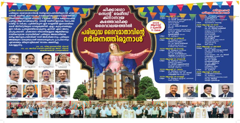 ചിക്കാഗോ: ചിക്കാഗോ സെന്റ് മേരീസ് ക്നാനായ കത്തോലിക്കാ ഇടവകയുടെ ഈ വര്ഷത്തെ പ്രധാന തിരുനാള് ഓഗസ്റ്റ് മൂന്നു മുതല് പതിനൊന്നുവരെ ദര്ശനത്തിരുനാളായി ആഘോഷിക്കുന്നു. ഇടവക മധ്യസ്ഥയായ പരിശുദ്ധ ദൈവമാതാവിന്റെ സ്വര്ഗ്ഗാരോപണത്തിരുനാളാണ് ദര്ശനത്തിരുനാളായി കൊണ്ടാടപ്പെടുന്നത്. ഇടവകസ്ഥാപിതമായിട്ട് പതിനഞ്ചു വര്ഷങ്ങള് പൂര്ത്തിയാകുന്ന വേളയില് നടത്തപെടുന്ന തിരുനാളിന് മെന് മിനിസ്ട്രിയിലൂടെ ഇടവകയിലെ എല്ലാ കുടുംബങ്ങളും പ്രസുദേന്തിമാരാകുന്നു എന്ന പ്രത്യേകതകൂടിയുണ്ട്.