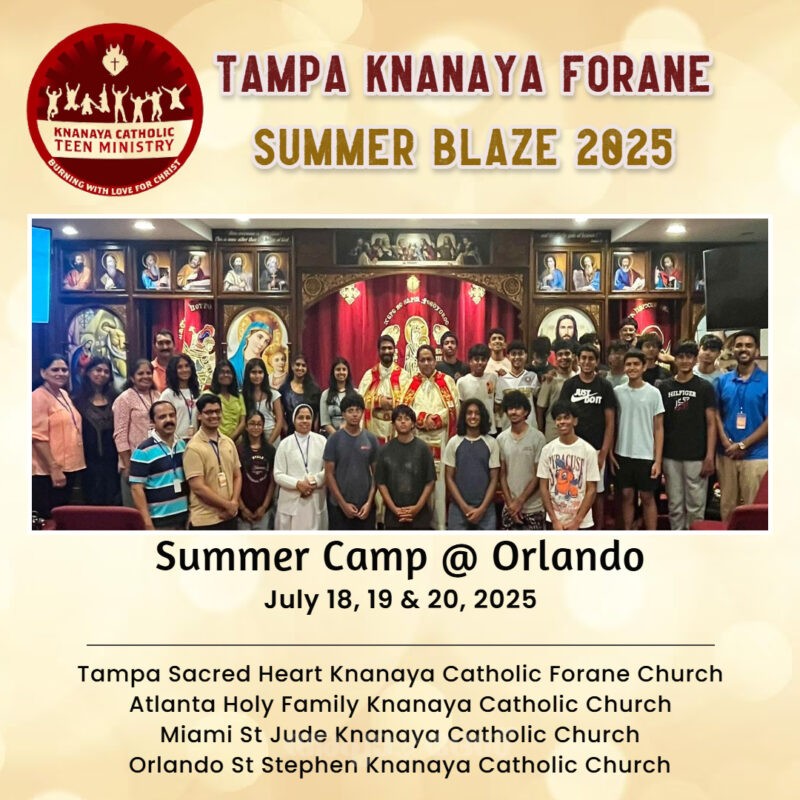 ഒര്ലാണ്ടോ: ക്നാനായ കത്തോലിക്കാ റീജിയണിലെ താമ്പാ ഫൊറോനാ തലത്തില് ഹൈസ്കൂള് കുട്ടികള്ക്കായി നടത്തിയ മൂന്നു ദിവസത്തെ സമ്മര് ക്യാമ്പ് ആവേശഭരിതമായി സമാപിച്ചു. ഫൊറോനാ വികാരി ഫാ. ജോസ് ആദോപ്പിള്ളിയുടെ മുഖ്യ കാര്മികത്വത്തില് നടന്ന വിശുദ്ധ കുര്ബാനയോടെ ക്യാംപിന് തുടക്കമായി. ഫാ. ജോബി പൂച്ചുകണ്ടത്തില്, ഫാ. ജോസ് ചിറപുറത്ത് എന്നിവര് സഹ കാര്മികരായിരുന്നു.