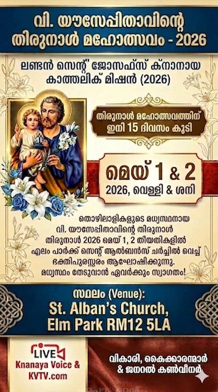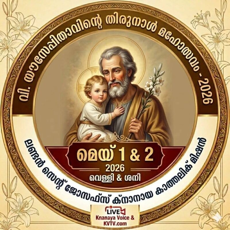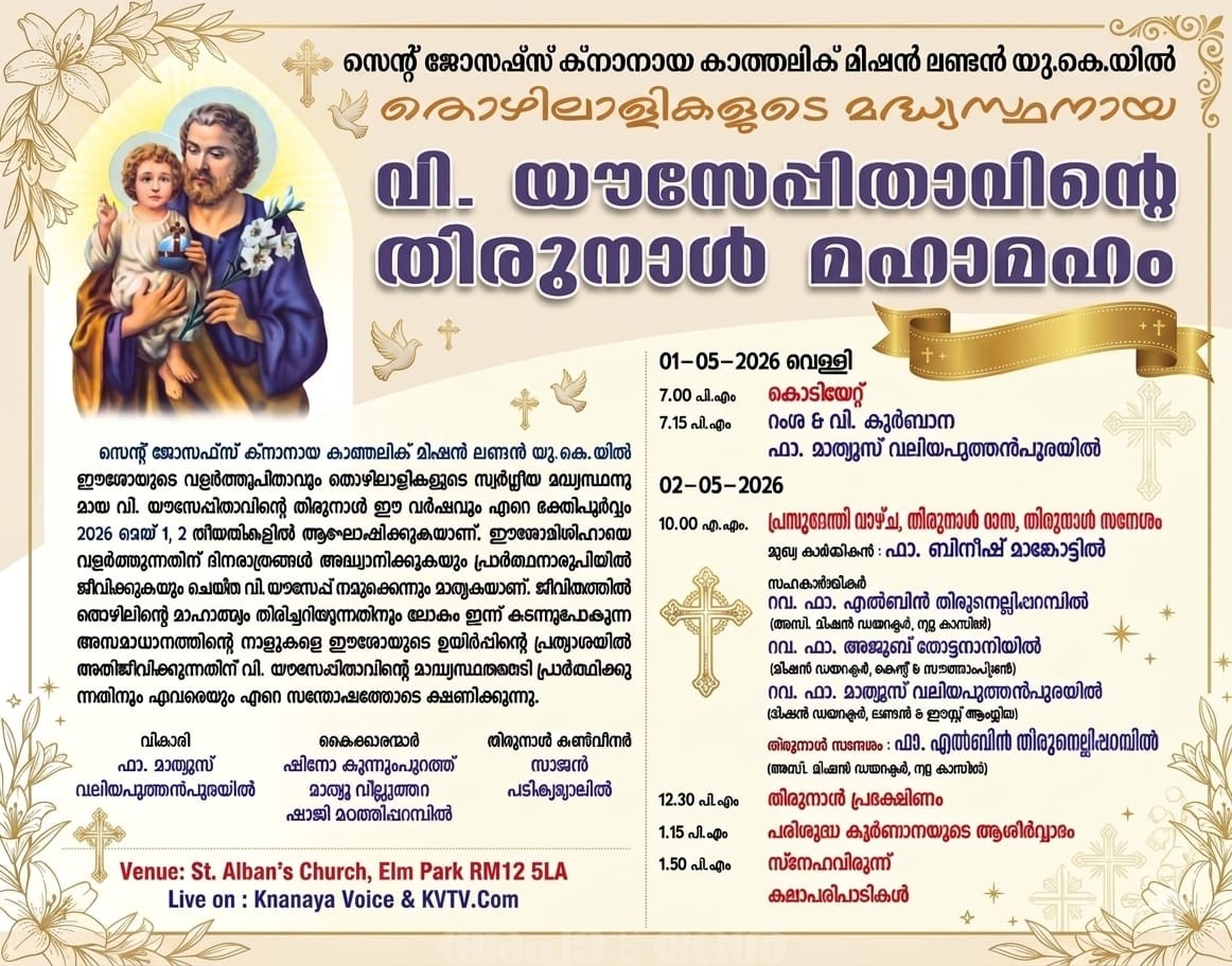 ലണ്ടന്‍: സെന്‍റ് ജോസഫ് ക്നാനായ കാത്തലിക ്മിഷന്‍ ലണ്ടന്‍ യു.കെയില്‍ വി. യൗസേപ്പിതാവിന്‍െറ തിരുനാള്‍ മെയ് 1, 2 തീയതികളില്‍ ആഘോഷിക്കും. മെയ് 1ന് വൈകുന്നേരം ഏഴിന് വികാരി ഫാ. മാത്യൂസ് വലിയപുത്തന്‍പുരയില്‍ കൊടിയേറ്റും. രണ്ടിന് രാവിലെ 10ന് നടക്കുന്ന തിരുനാള്‍ റാസയ്ക്ക് ഫാ. ബിനീഷ് മാങ്കോട്ടില്‍ മുഖ്യകാര്‍മികത്വം വഹിക്കും.