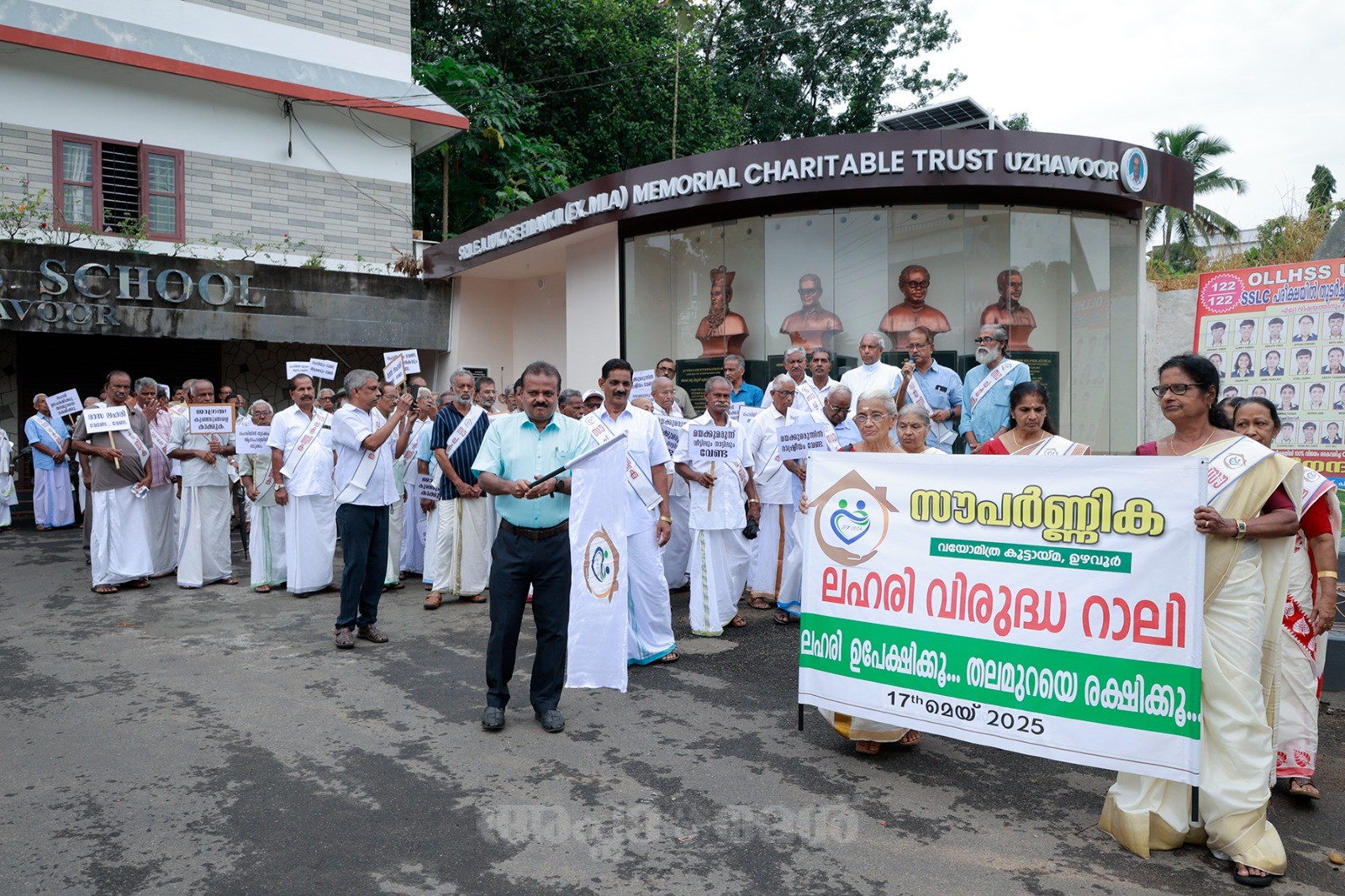ഉഴവൂര്: മയക്കുമരുന്നിനും രാസലഹരിക്കും എതിരായി സൗപര്ണിക എന്ന വയോജന കൂട്ടായ്മയുടെ നേതൃത്വത്തില് റാലി നടത്തപ്പെട്ടു. കോട്ടയം എ.ഡി.എം എസ് ശ്രീജിത്ത് റാലി ഫ്ളാഗ് ഓഫ് ചെയ്തു.ഫാ. അലക്സ് ആക്കപ്പറമ്പില് ആശംസകള് നേര്ന്നു. പഞ്ചായത്ത് ജംഗ്ഷനില് റാലി എത്തിയപ്പോള് സൗപര്ണികയുടെ രക്ഷാധികാരി ഡോ.തോട്ടം ശിവകരന് നമ്പൂതിരി ലഹരി വിരുദ്ധ പ്രതിജ്ഞ ചൊല്ലിക്കൊടുത്തു. തുടര്ന്ന് സംസ്ഥാന ഗവണ്മെന്്റിനും കോട്ടയം കളക്ടര്ക്കും ഉഴവൂര് പഞ്ചായത്ത് ഭരണസമിതിക്കും നല്കുന്നതിനായി സൗപര്ണിക അംഗങ്ങള് ശേഖരിച്ച ആയിരത്തോളം അംഗങ്ങള് ഒപ്പിട്ട നിവേദനം പഞ്ചായത്ത് പ്രസിഡണ്ട് തങ്കച്ചന് കുടിലില് ഏറ്റുവാങ്ങി . സൗപര്ണിക പ്രസിഡണ്ട് ഡോ. ഫ്രാന്സിസ് സിറിയക്, സെക്രട്ടറി കെ.യു എബ്രാഹാം തുടങ്ങിയവര് പ്രസംഗിച്ചു .റാലിക്ക് ഡോ. തോട്ടം ശിവകരന് നമ്പൂതിരി, ഡോ.സൈമണ് ജോസഫ് ,പ്രൊഫ. സ്റ്റീഫന് ജോസഫ്, ഡോ. ഷൈനി സ്റ്റീഫന് ,അഡ്വ. സാബു സ്റ്റീഫന്, മാനുവല് എബ്രഹാം, ആനന്ദക്കുട്ടിയമ്മ എന്നിവര് നേതൃത്വം നല്കി.