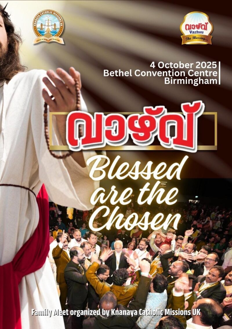 ബര്മിംഗ്ഹാം: ഗോത്രമഹിമയുടെ തനിമയും, പൂര്വ്വികര് പകര്ന്നുനല്കിയ പാരമ്പര്യവും, നെഞ്ചോടുചേര്ത്ത വിശ്വാസവും മുറുകെപ്പിടിച്ച് ലോകമെങ്ങും വ്യാപിച്ചുകിടക്കുന്ന ക്നാനായ കത്തോലിക്കാ സമൂഹത്തിന്റെ ചരിത്രപുസ്തകത്തില് ഒരു സുവര്ണ്ണ അധ്യായം കുറിക്കാന് ‘വാഴ്വ് 2025’ മഹാസംഗമം ഒരുങ്ങുന്നു. യുകെയുടെ ഹൃദയഭാഗമായ ബര്മിംഗ്ഹാമിലെ ബഥേല് കണ്വന്ഷന് സെന്ററില്, 2025 ഒക്ടോബര് 4-ന് ശനിയാഴ്ച, ഈ ചരിത്ര സംഗമത്തിന് അരങ്ങുണരും. നമ്മുടെ കൂട്ടായ്മയുടെ വേരുകള് ആഴത്തിലോടാനും വിശ്വാസത്തില് തഴച്ചുവളരാനുമുള്ള ഈ അപൂര്വ്വ സംഗമത്തിനായി യുകെയിലെമ്പാടുമുള്ള ക്നാനായ മക്കള് ആവേശത്തോടെ കാത്തിരിക്കുന്നു.